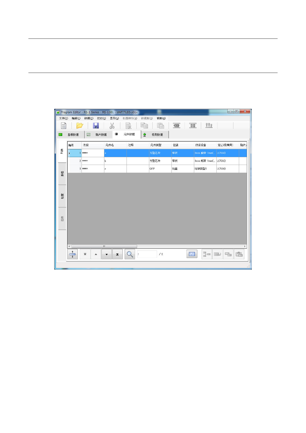 「元件数据」,是针对在「贴片数据」中输入的“元件名称”输入详细的信息数据。