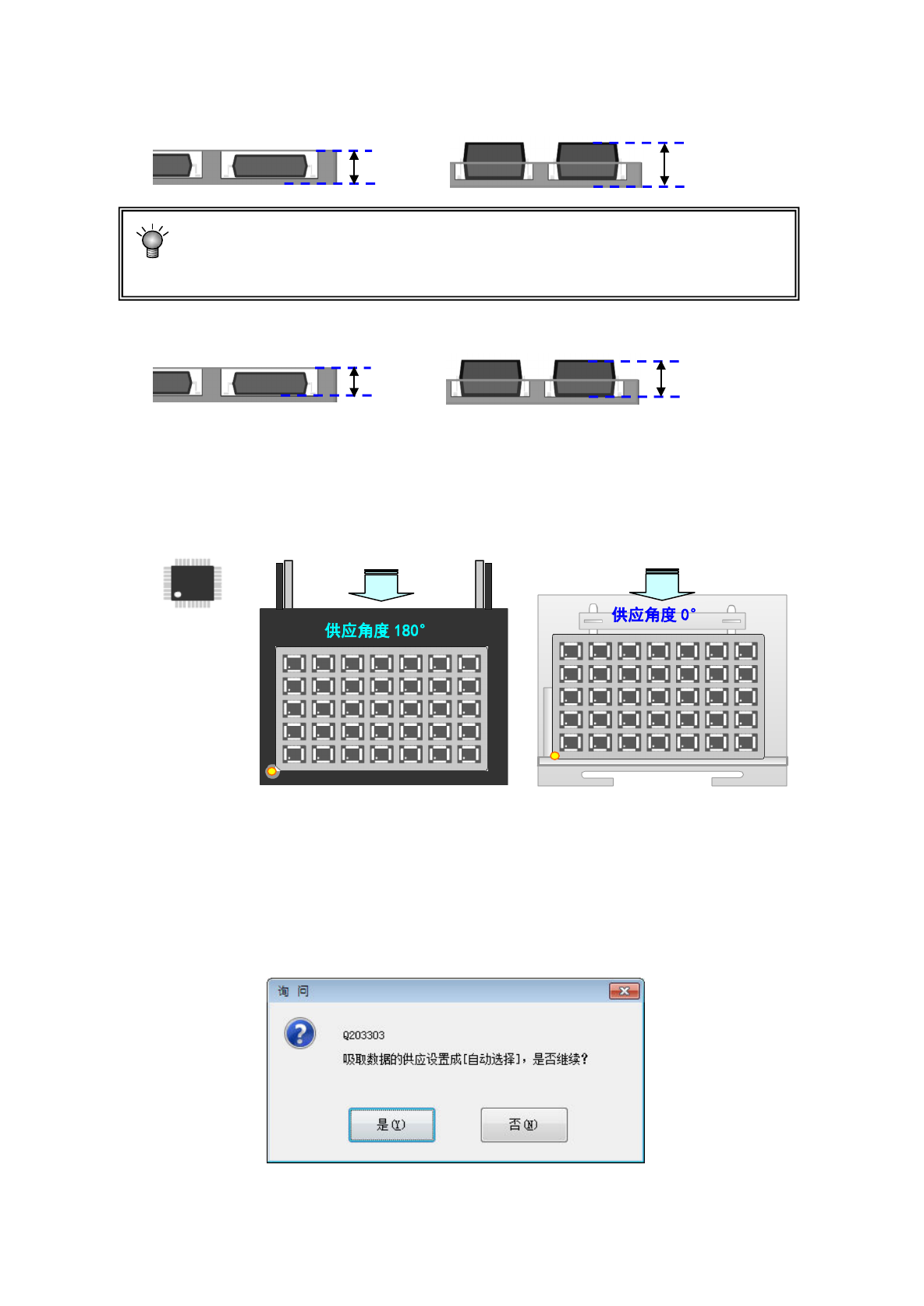 以 JUKI 的元件供应角度为 0°,输入托盘上的元件包装姿势倾斜的角度。