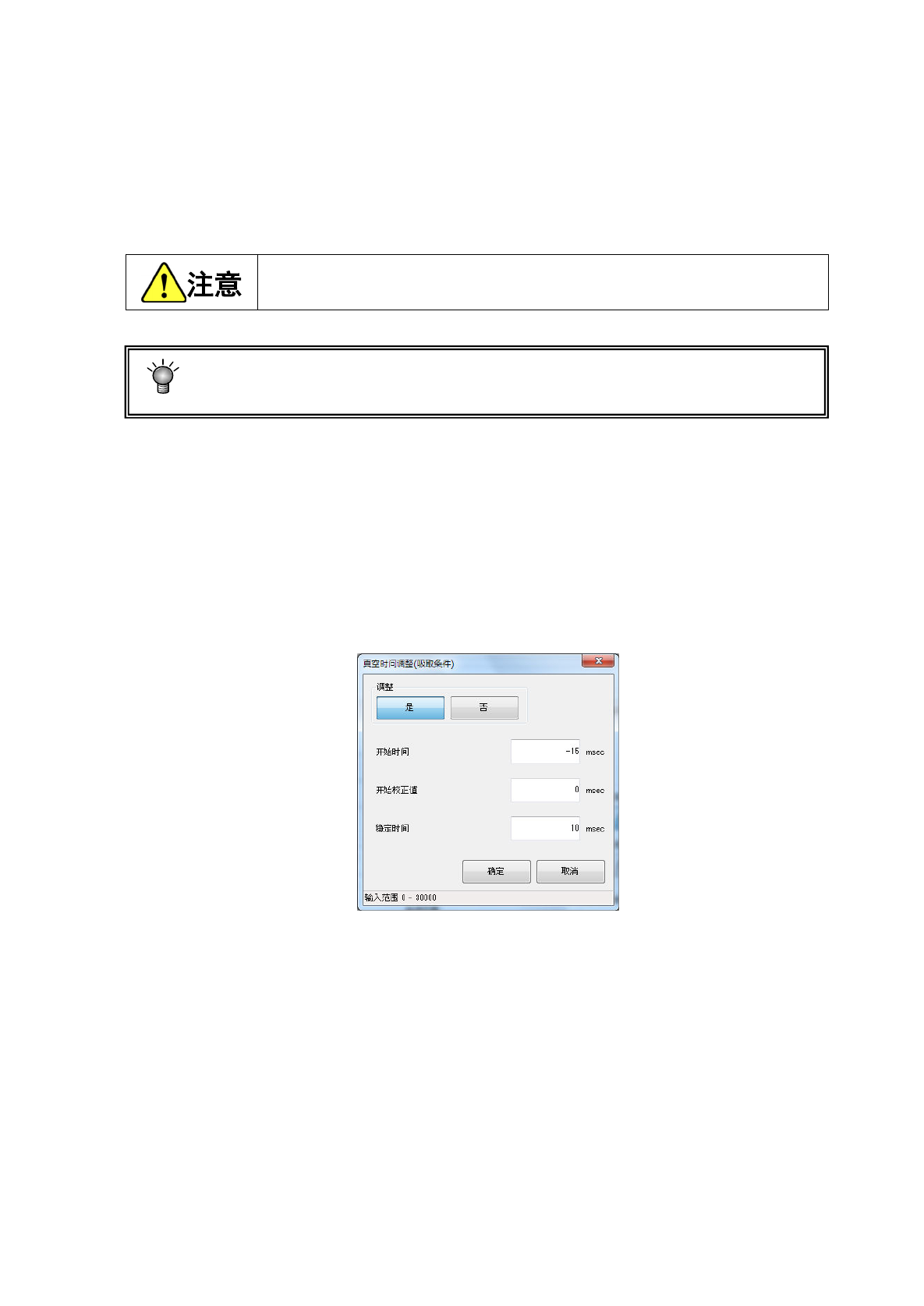 将调整设定为「是」,可按照 ms 为单位输入“开始时间”、“开始校正值”、“稳定时间”的调整。