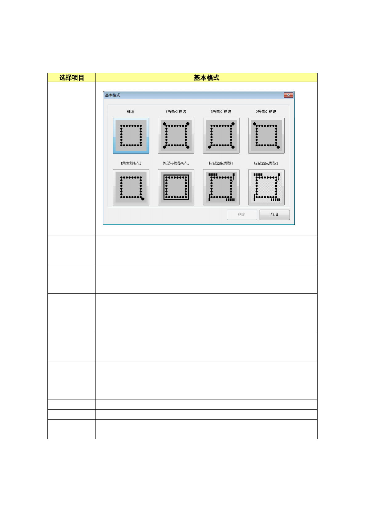 第 1 部 基本篇 第 4 章 制作生产程序 4-99 ③ 基本格式 设置基本格 式 ( 标记配 置图案 ) 。 与球面图案 组合作为 识别图案使用。 浏览 显示标准~标 记溢出的样 本图形。 标准 包装外围只有 球的类型。 原有的 BGA 小间距、小球版。 格子上有索 引球也可 。 4 角索引标记 包装外围只有 球与索引球 , 索引球在格子 外的类型。 索引球配置在 格子外的 4 角。 3 角索引标记 包装外围只有 球与索引球 , 索…