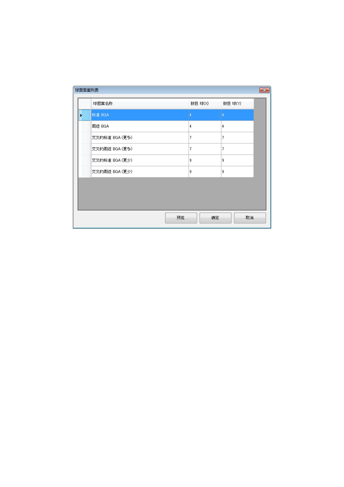 第 1 部 基本篇 第 4 章 制作生产程序 4-104 选择球面图 案,点击 [ 预 览 ] 按钮时, 即显示选 择的球面图案 的预览。 标准类型 BGA 外围类型 BGA 交叉标准类型 BGA( 外围多 ) 交叉外围类型 BGA( 外围多 ) 交叉标准类型 BGA( 外围少 ) 交叉外围类型 BGA( 外围少 ) 球数 X 球的列数 ( 横方向的 球个数 ) Y 球的行数 ( 纵方向的 球个数 ) 选择 [ 关闭 ] 按钮 ,返回选…