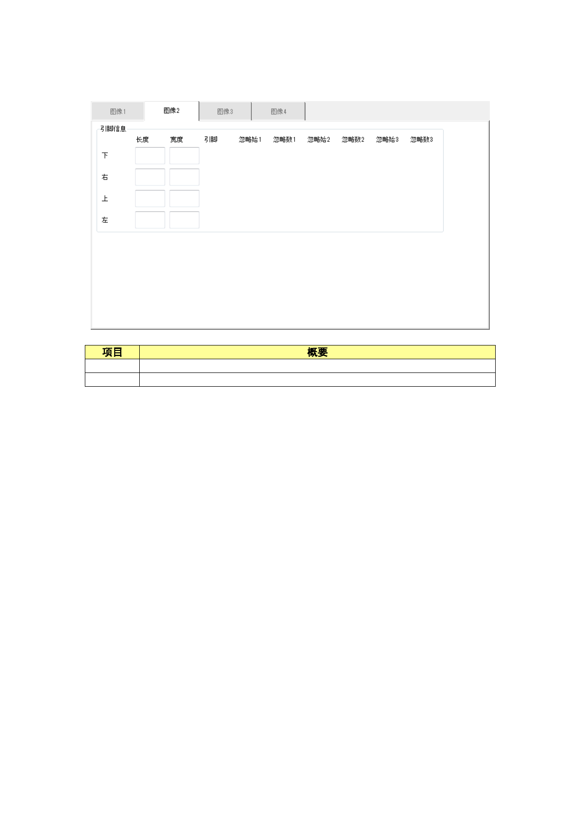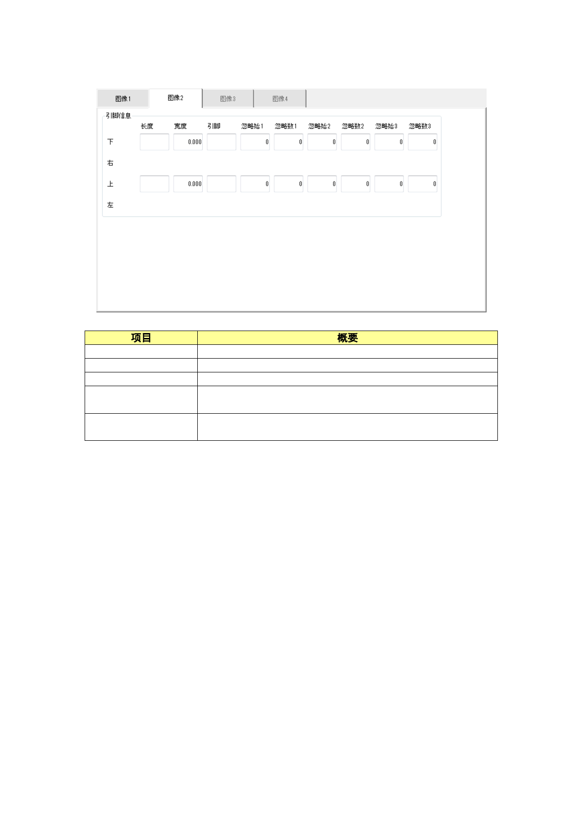 第 1 部 基本篇 第 4 章 制作生产程序 4-1 1 1 在「图像 2 」选 项卡中设置 引脚信息。 长度 输入引脚接触 基板部 分的长度。 宽度 输入引脚宽度 。 引脚 如果是引脚元 件时, 输入引脚数。 忽略始(开始 ) 1 ~ 3 输入欠缺引脚 位置。 输入范围 0 ~引脚根 数(默认值 : 0 ) 。 忽略数 (缺少数 ) 1 ~ 3 输入欠缺引脚 数。 输入范围 0 ~引脚根 数(默认值 : 0 ) 。