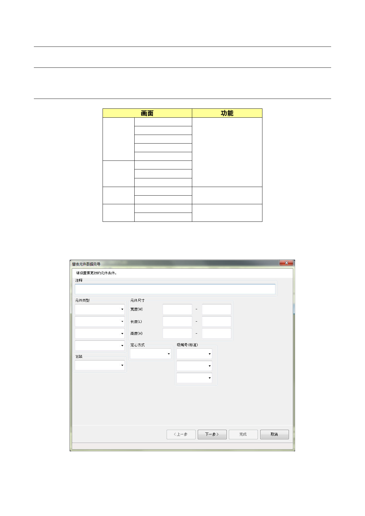 第 1 部 基本篇 第 4 章 制作生产程序 4-156 可设置的条 件如下所 示。 注释 指定注释。 如果输入的字 符串在 注释中存在时,即成 为替换对象 的记录。 元件类型 元件种类最多 可指定 4 种。 当指定多种元件 时, 所指 定的所有的元 件 均为指定对象 。 1 个也不输入时 ,所有元件 种类均为设定对象 。 元件尺寸 逐一指定元件 的长度 、宽度、高度的最大 值和最小值 。 如果省略输入 ,则按 各自可输入的最大、 最小…