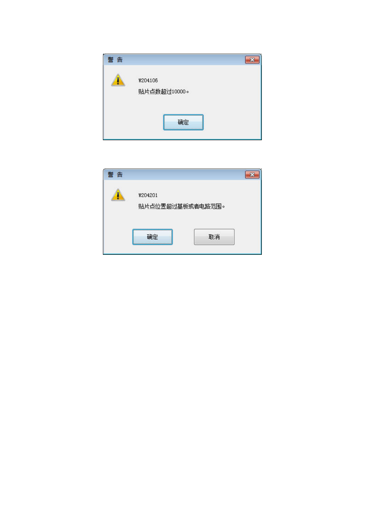 贴片位置超出基板或电路范围时,会显示以下提示信息。
