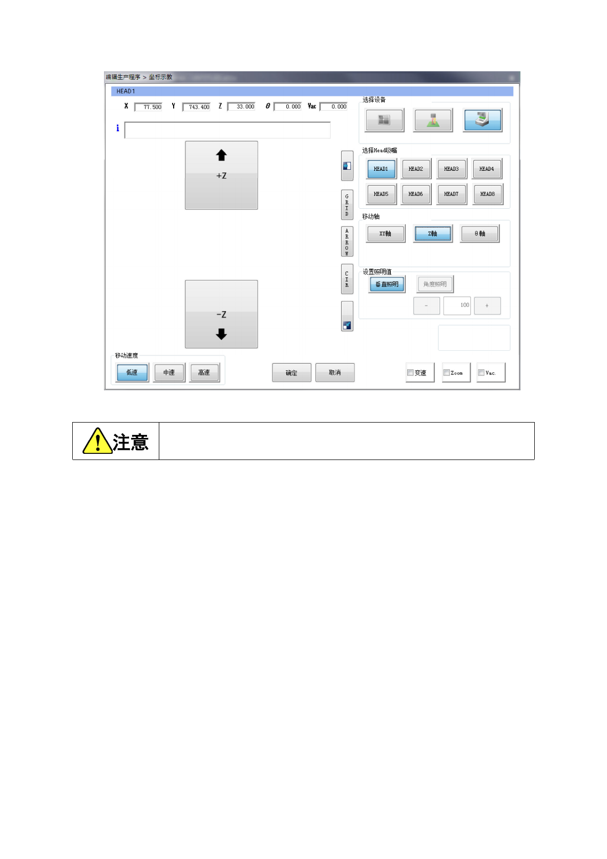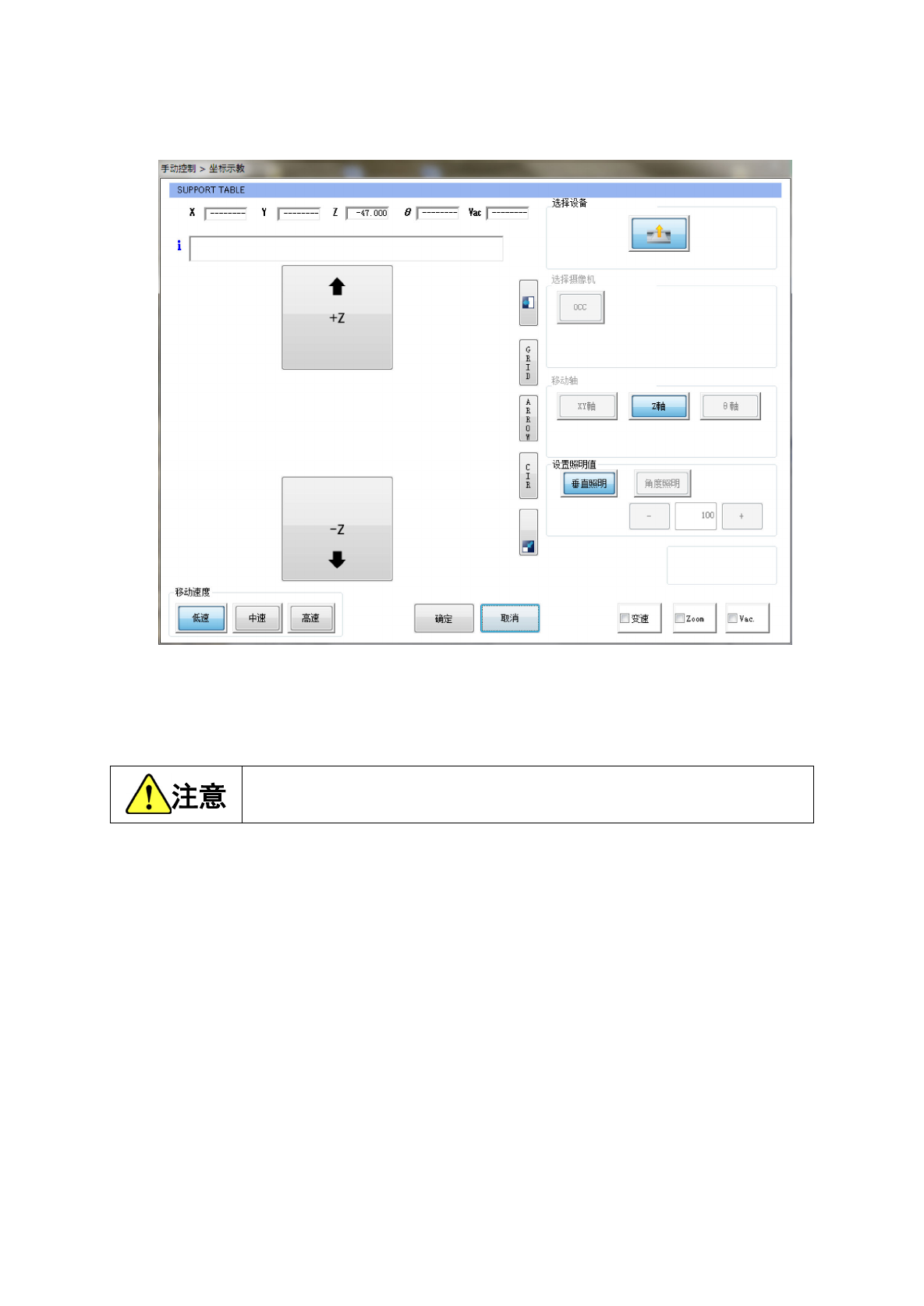 支撑台移动的当前坐标,会显示在画面上部。