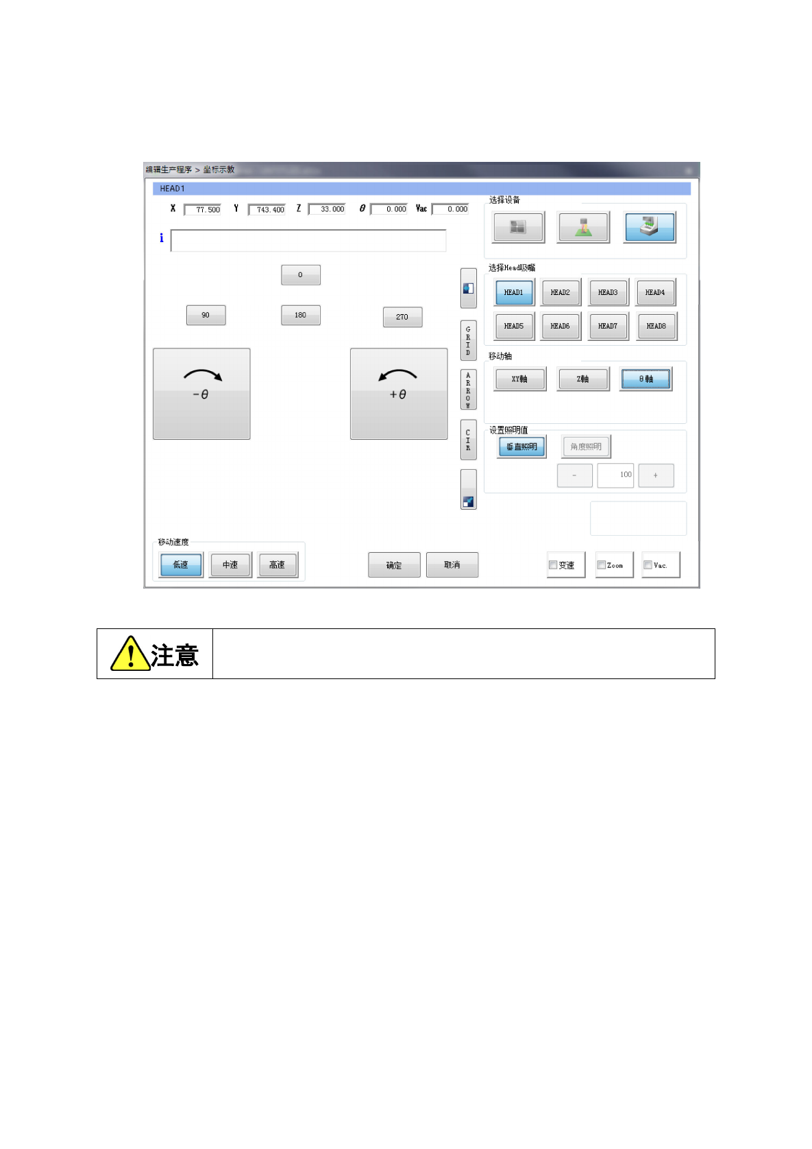 按[0]、[90]、[180]、[270]按钮,吸嘴 Head 即旋转到各数值的角度。