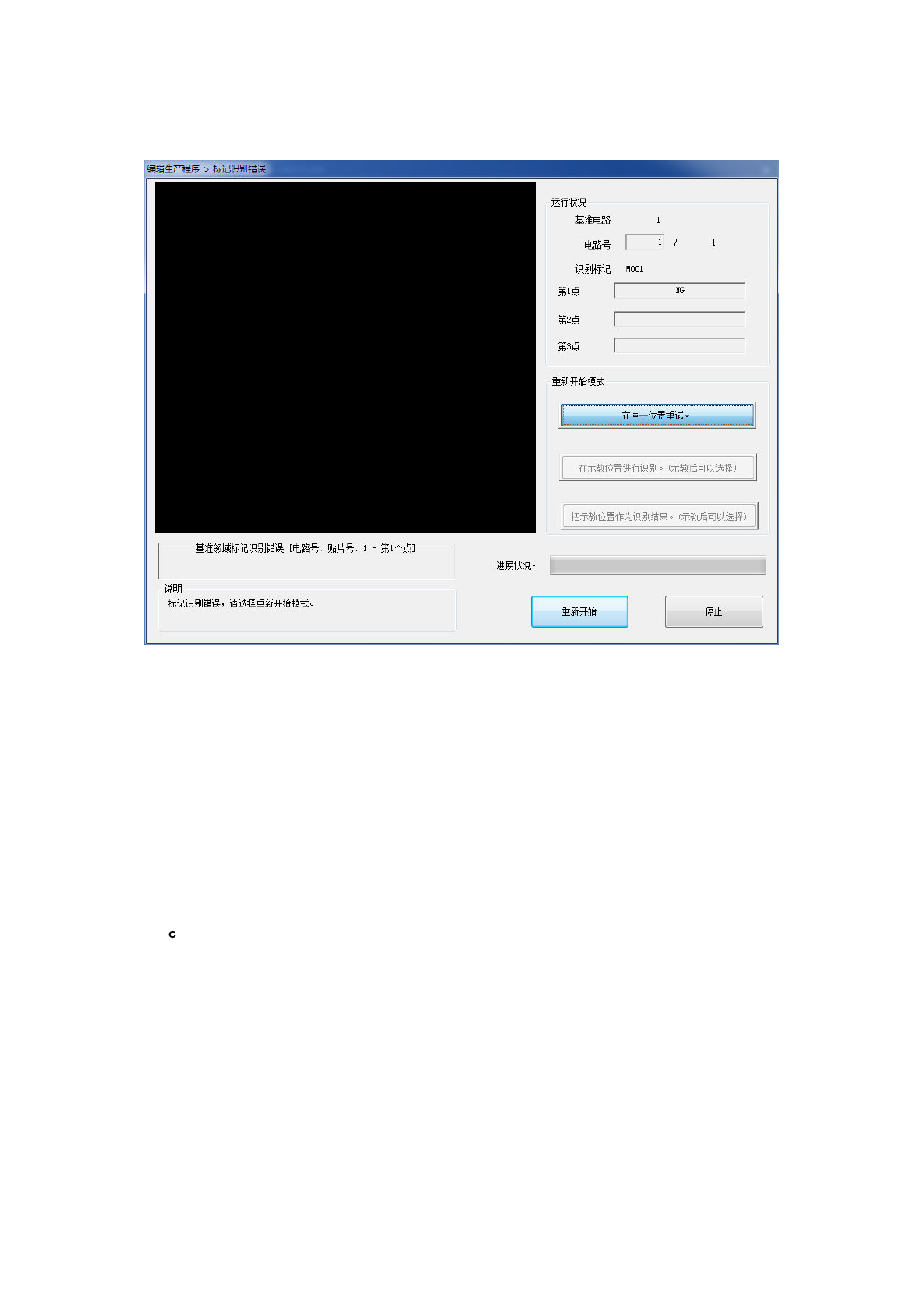 当执行基准领域标记识别失败时,会在画面的“说明”栏中显示提示信息,可以选择“重新开始模式”