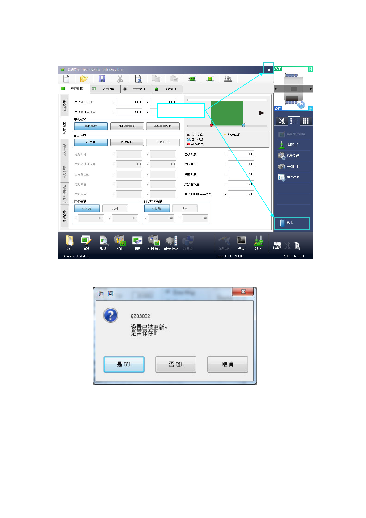 第 1 部 基本篇 第 4 章 制作生产程序 4-294 4-7 退出编辑程序 请点击编辑 程序窗口 又右上角的 [X] ,或 从信息区域 的应用程序 快捷方式点击 [ 退出 ] 。 如果程序有 所变更而 尚未保存时,会 显示如下提示 信息。 ●是 :保存。保存后退出 编辑程序。 ●否 :不保存,退出编辑 程序 。 ●取消 : 取消退出 处理。 点 击 任 何 一 处