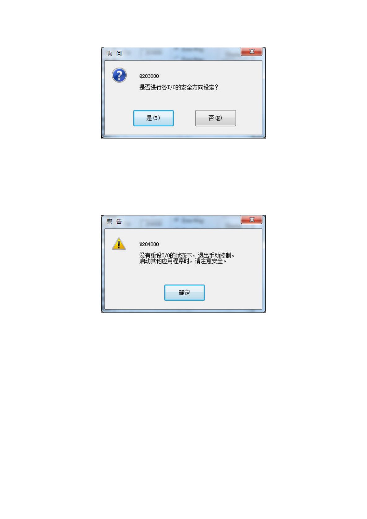 在各 I/O 安全方向设置确认提示信息中选择「否」时,会显示以下提示信息。