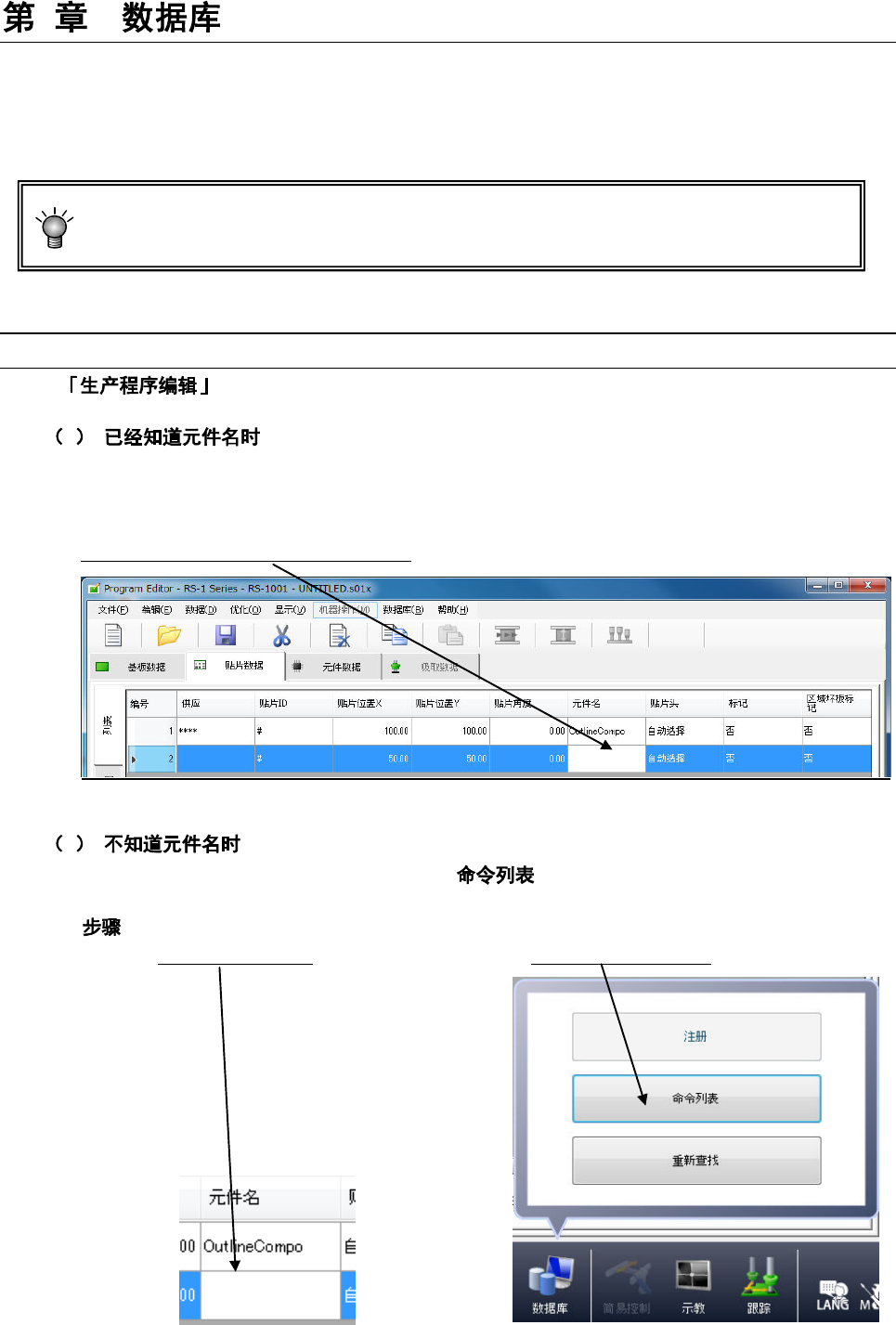 ① 请单击空白的元件名称栏。 ② 请单击「数据库」/「命令列表」。