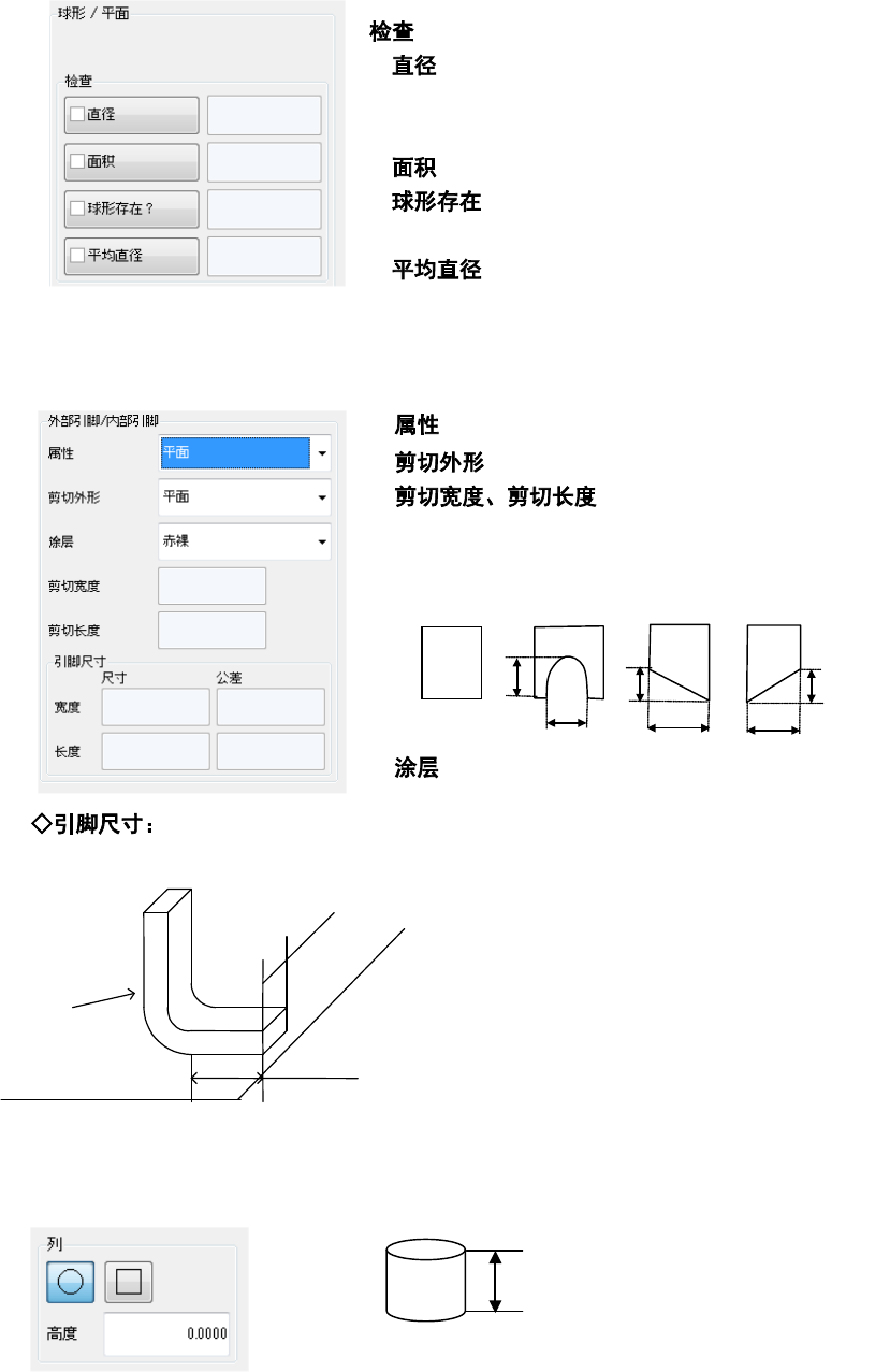 第 2 部 功能详解 篇 第 6 章 通用图像元件 6-9 ● 球形 / 平面 在 “ 类型 ” 中选择 了球形 或平面( Land )时 显示此项。 选择球形或平 面的形状。 ( 但现在不进行形 状判别。 ) ● 外部引脚 / 内部引 脚 在 “ 类型 ” 中选择 了外部引脚 或内部引脚时 显示此项。 当使用鸥翼 形引脚时 ,输入与基板接 触的引脚前端 部位的宽和长。 长度 宽度 引脚 基板 ● 列 在 “ 类型 ” 中选 择了列时 …
