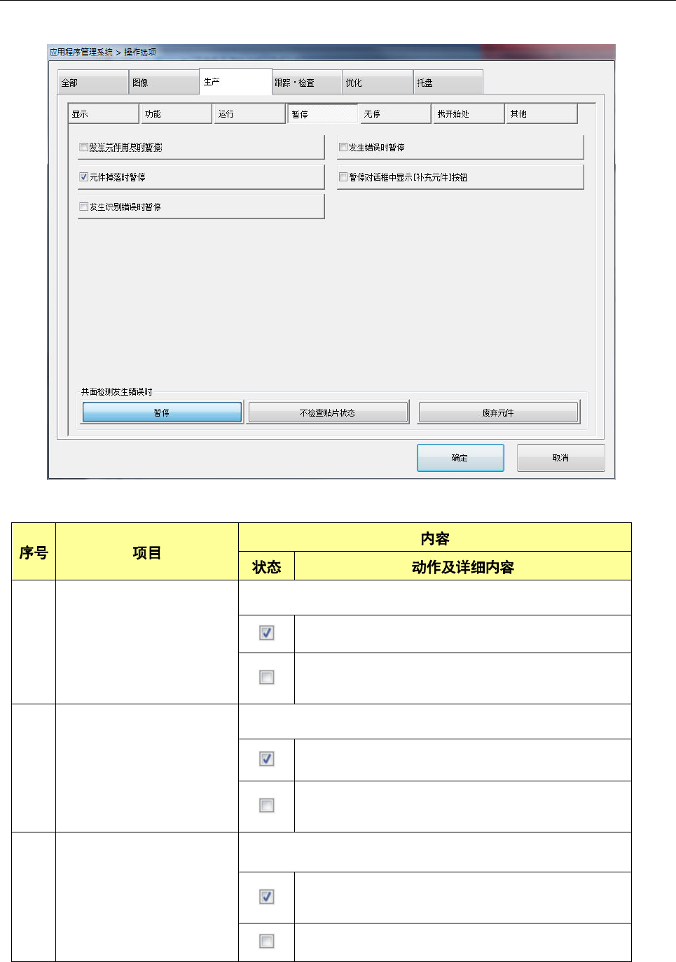 生产动作发生错误(包括元件用完)时,暂停生产。