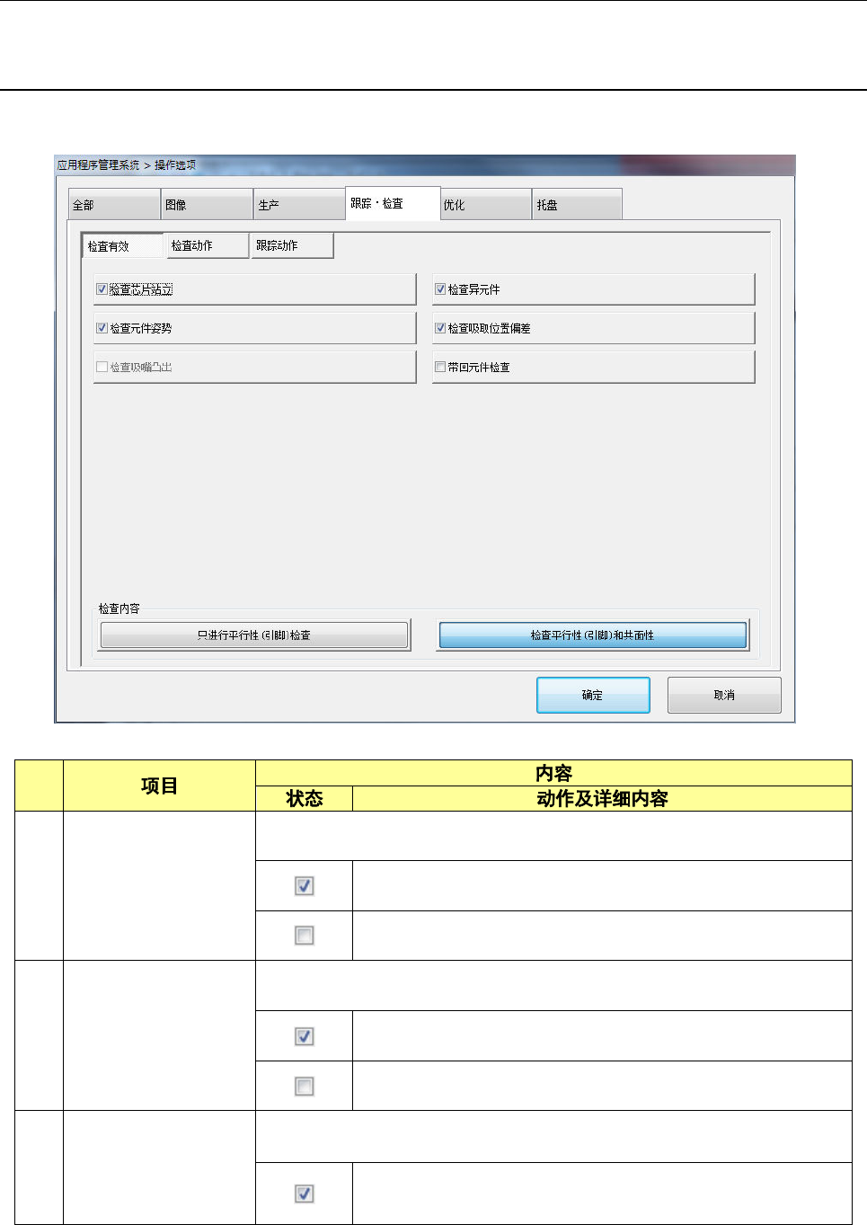 第 2 部 功能详解篇 第 7 章 操作选项 7-24 7-5 跟踪、检查 设置跟踪、 检查的操作选 项。 7-5-1 检查有效 按下[检查 有效]按钮, 会显示 “ 检 查有效选项设 置画面” 。 No. 1 检查芯片站 立 设置执行芯 片站立检 查。 对元件数据的 [ 芯片站立 ] 有 效的元件, 进行芯片 站立检查。 与元件数据的设 置无关, 不进行芯片 站立检查。 2 检查异元件 设置执行检 查异类元 件功能。 对元件数据的 […