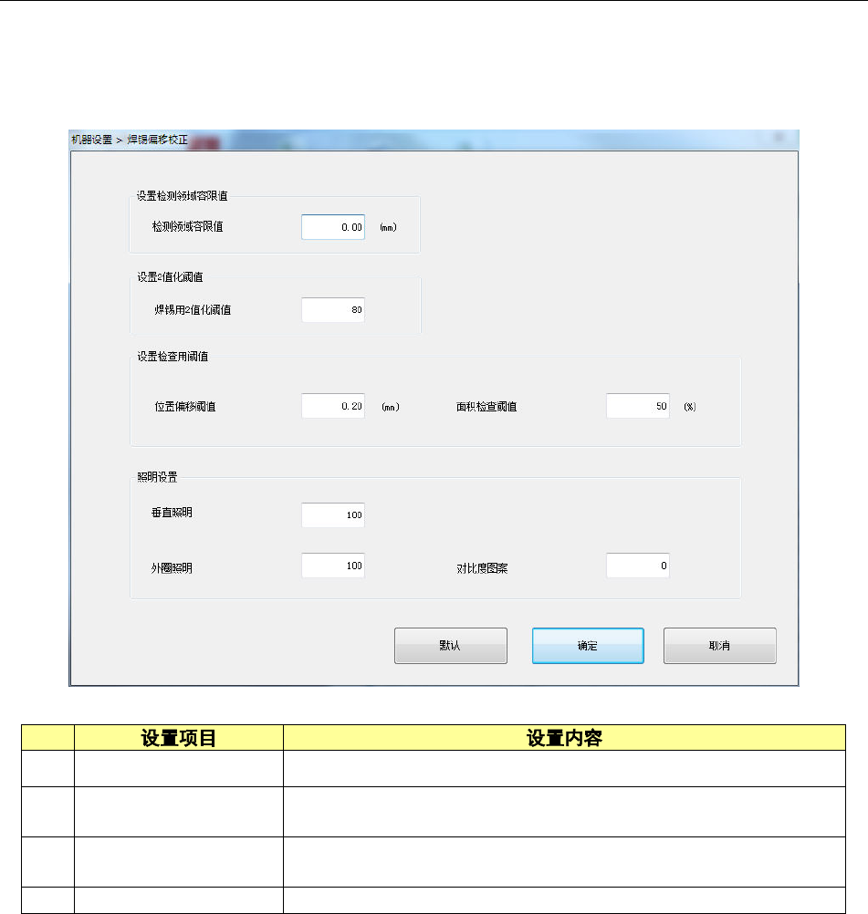 1) 在编辑框里分别设置检测领域容限值、焊锡用 2 值化阈值、位置偏移阈值、面积检查阈值、