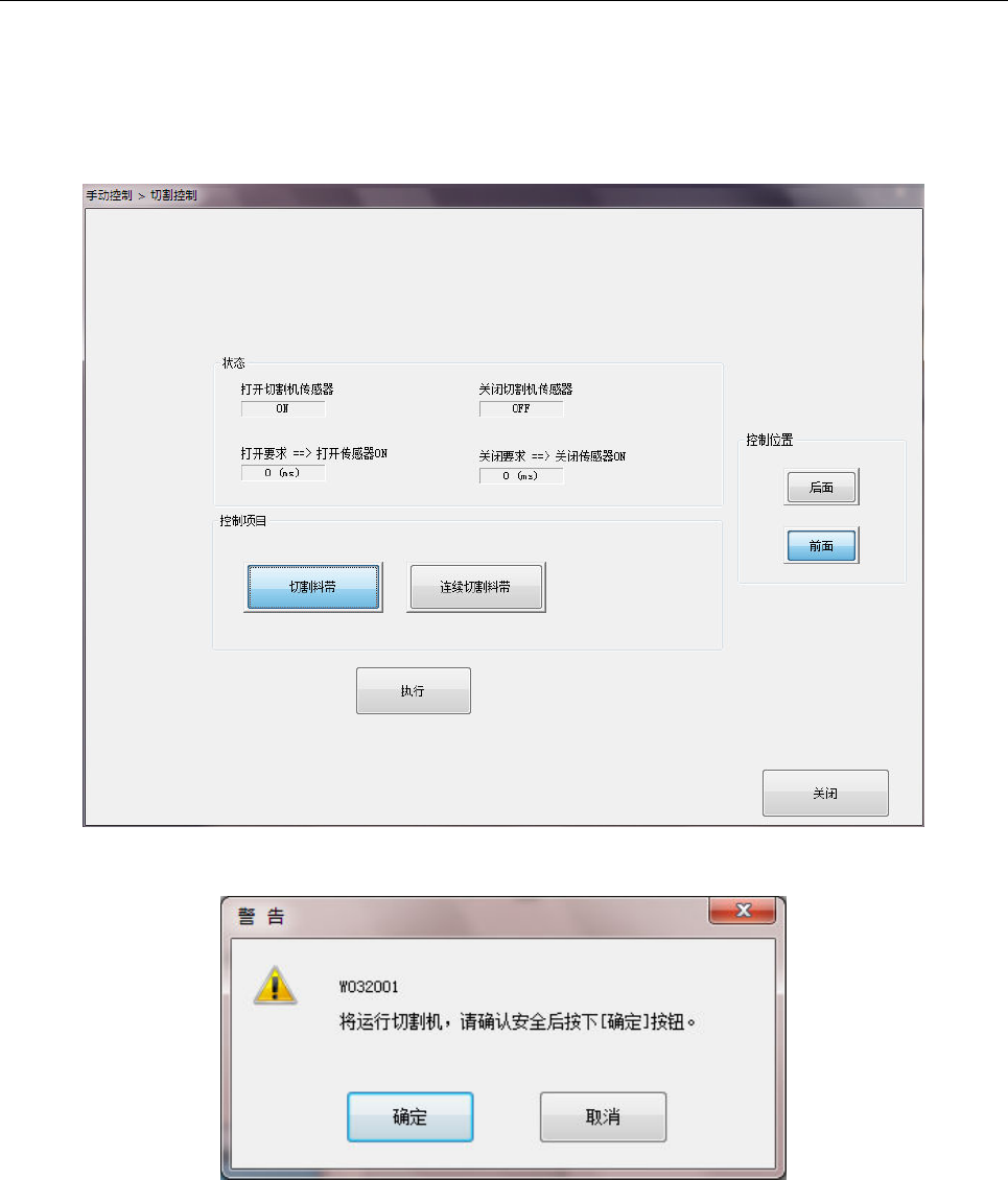 或[连续切割料带])动作,按下[执行]按钮。按下[执行]按钮后,会显示对话框,按下[执行]按钮后,即
