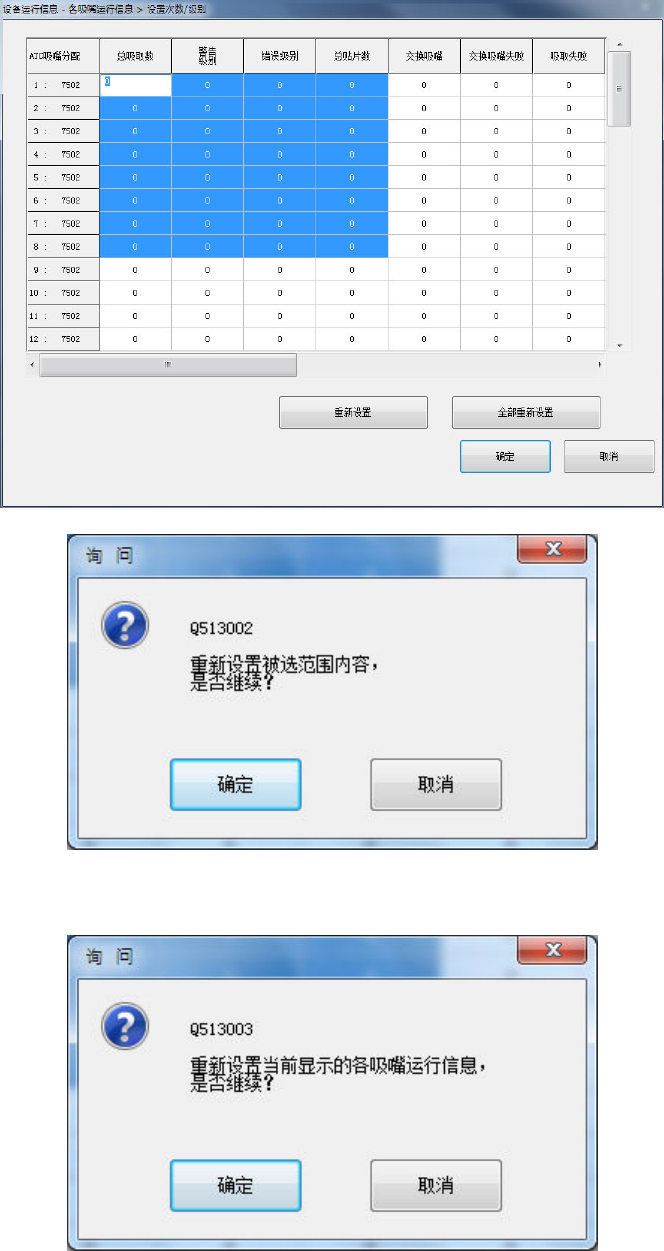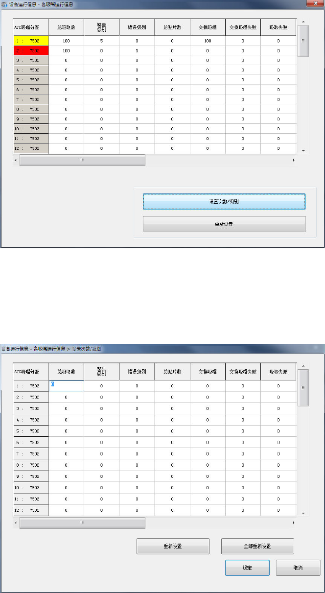 按下[设定次数/级别]按钮后,或菜单的[设定]-[设定-各吸嘴运行信息]后,即可显示[设置