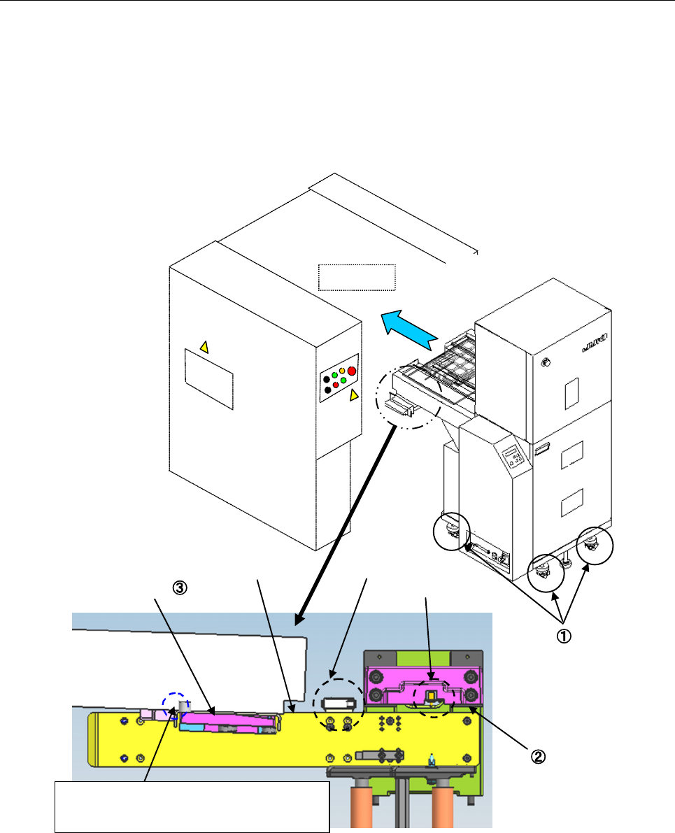 (2) 调整 MTS 的脚轮调节器①,使主体的台架支架基准面②与 MTS 的连接块上面③处于相同高度,