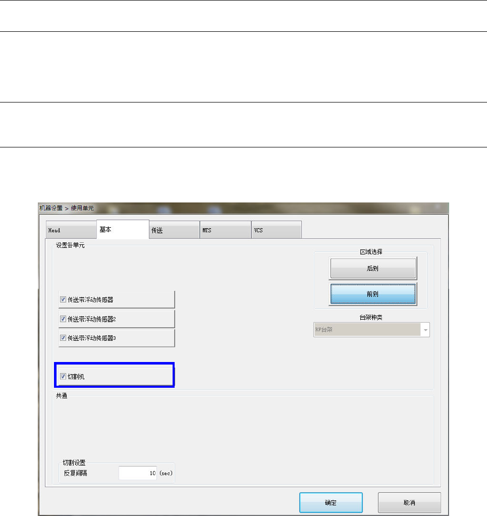 第 2 部 功能详解篇 第 12 章 选项组件 12-30 12-5 切割机 12-5-1 概述 贴片后自动 切断带料 ,统一处理。 为安装在主 机上的一 体化装备型,固 定台架与统一 更换台都可使用 。 12-5-2 操作方法 12-5-2-1 机器设置 请从机器设 置画面选 择 [ 使用单元 ] → [ 基 本 ] ,确认「 切割机」已被勾 选。 关于设置方 法请参照「 8-3 -1-2 基本」 。