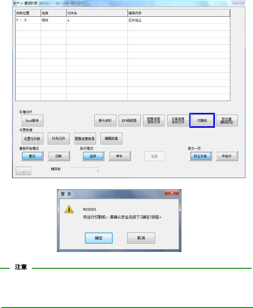 按下[切割机]按钮后,将显示警告信息,此时若按下[确定]即进行切割动作。