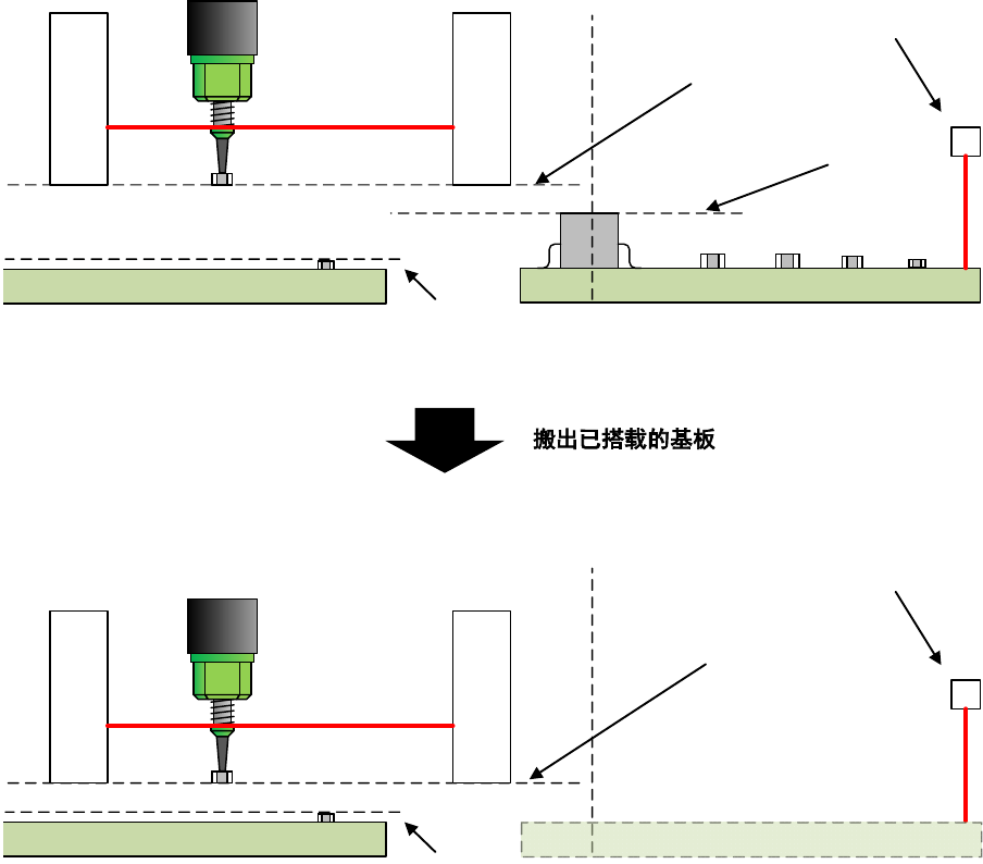 已完成贴片的基板在 OUT 传感器上搬出待机时,对于超过贴片头可移动极限尺寸的基板,当处