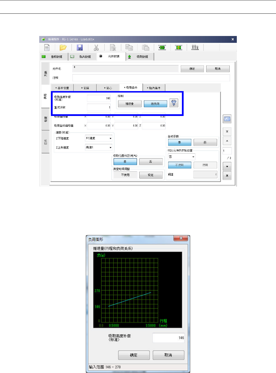 对于低负荷控制用吸嘴,图形按钮会变为显示开启,按下图形按钮后,即显示推进量(行程)和负荷值