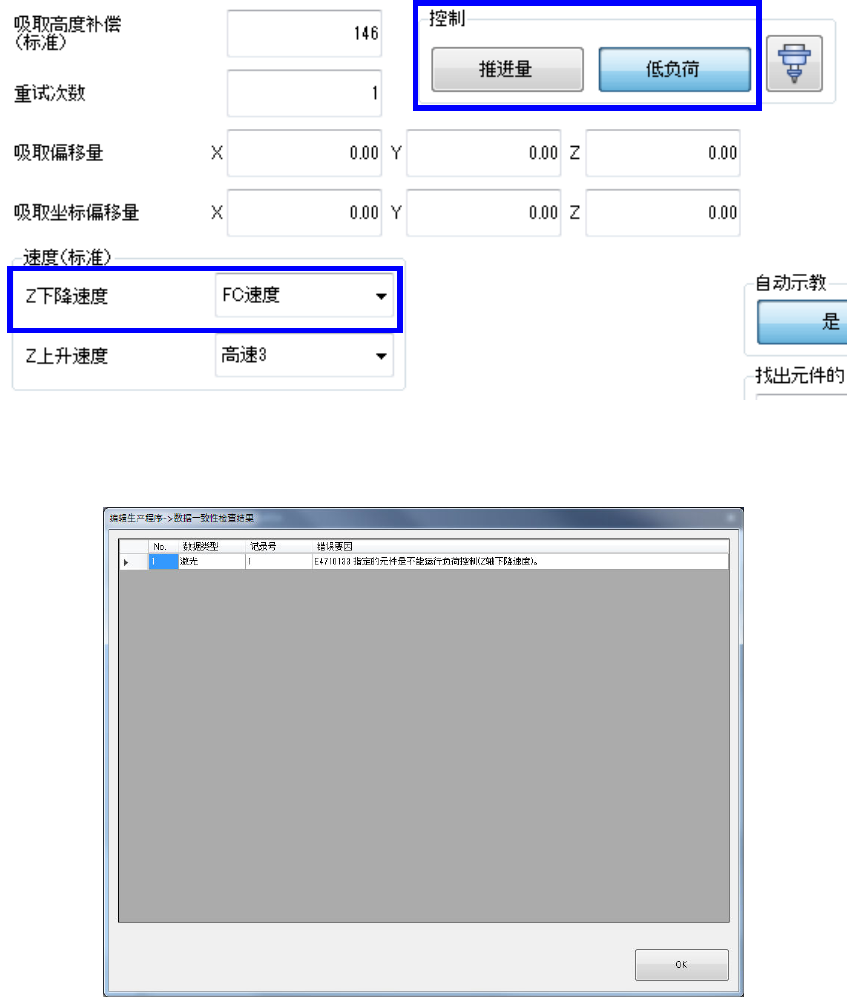 Z 轴下降速度不是 FC 速度,推进量为负荷输入(g)时,一致性检查时会发生错误。
