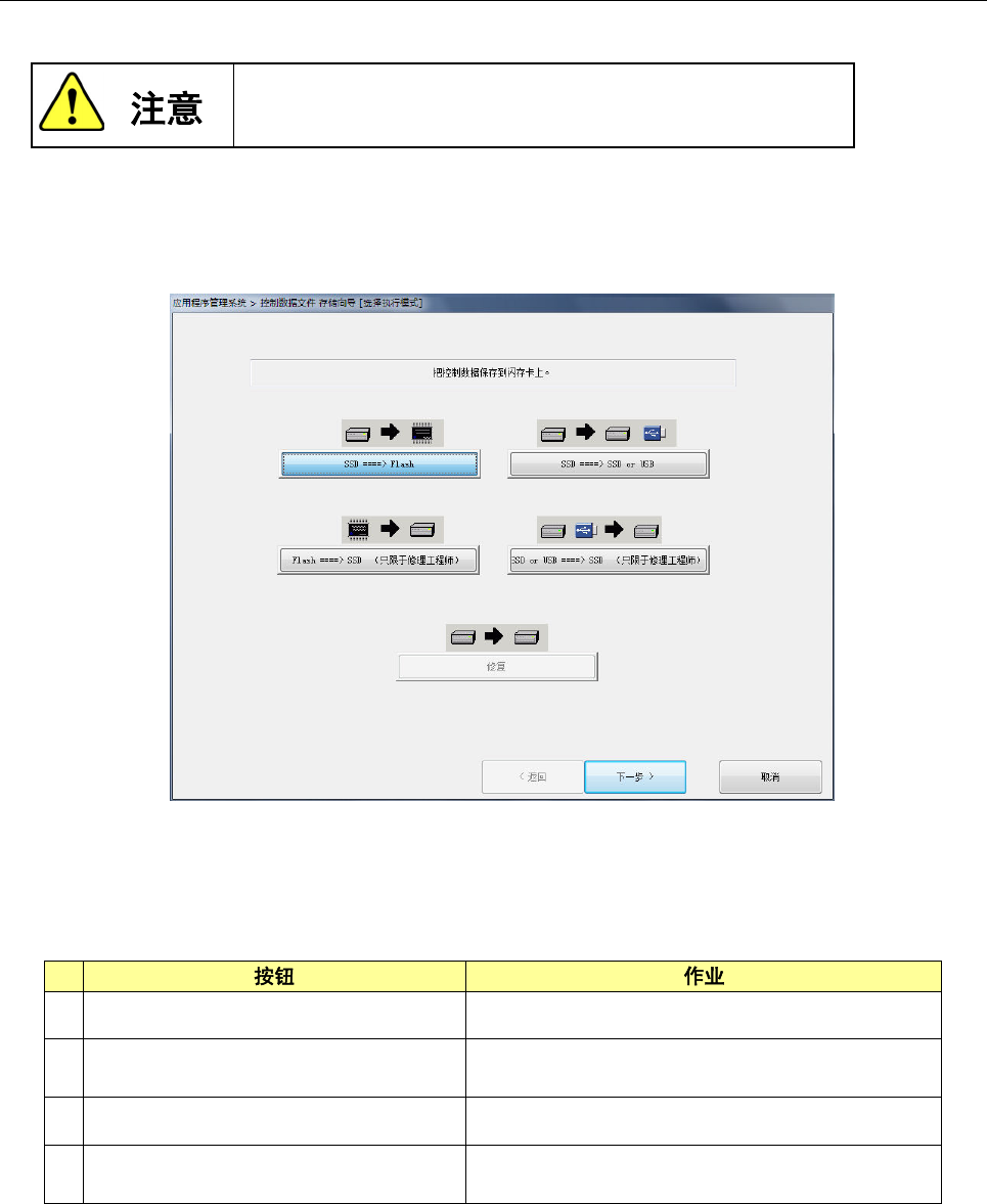第 2 部 功能详解篇 第 13 章 程序补充 13 - 10 13-2-1 将控制数据保存到闪存的处理 选择 1. [ SS D ===> Flash ] (把控制 数据保存到 主机闪存 上)后,显示 如下的画面。 确认要保存 的内容后 ,请按 [ 下一步 >] 按钮 。 如果要变更 操作内容 等,请按 [< 返回 ] 按钮 。要结束 作业时请按 [ 取消 ] 按 钮。 按 [ 运行 ] 按钮 来保存 控制数据。