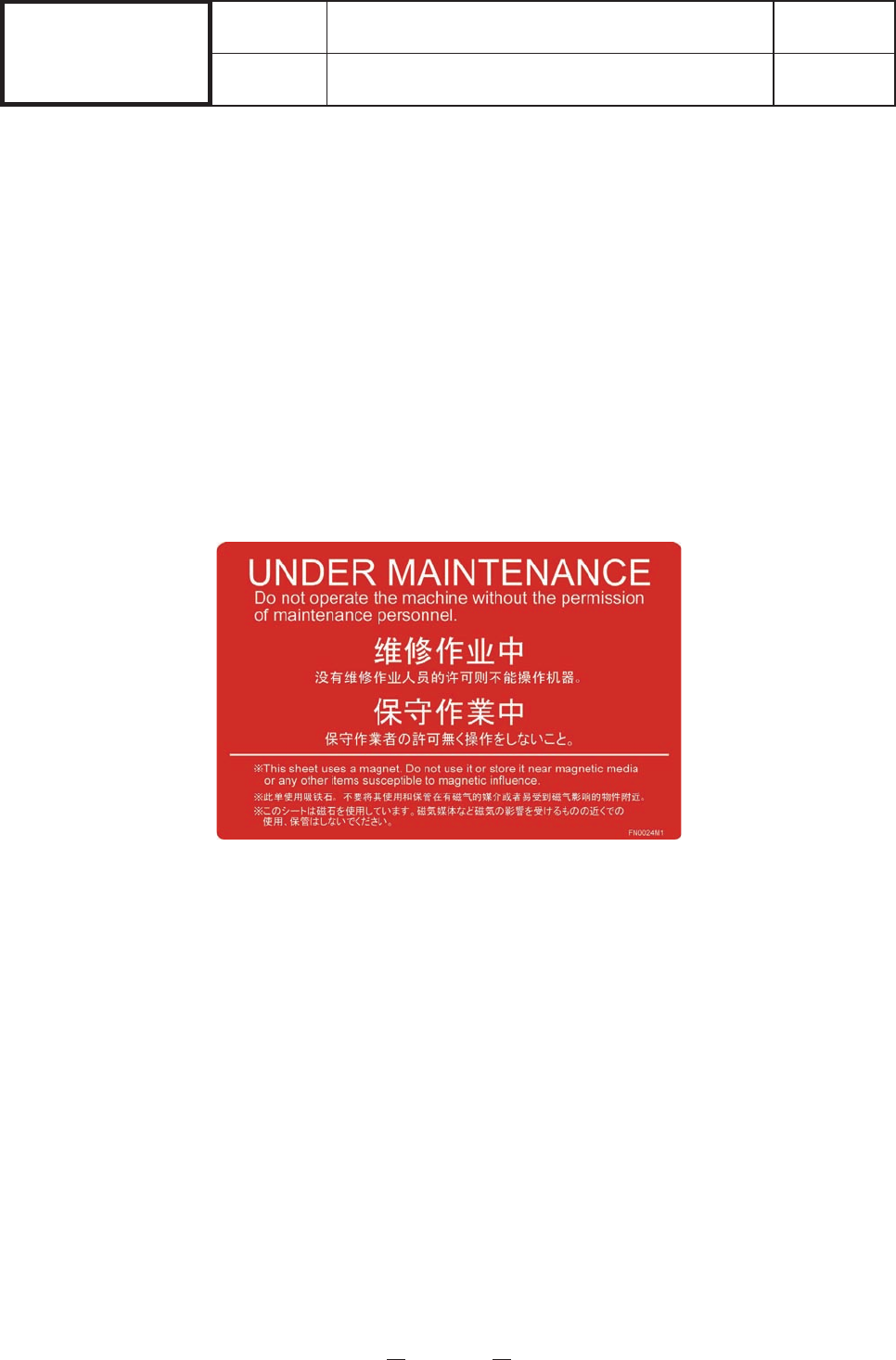 Warning sheet in maintenance