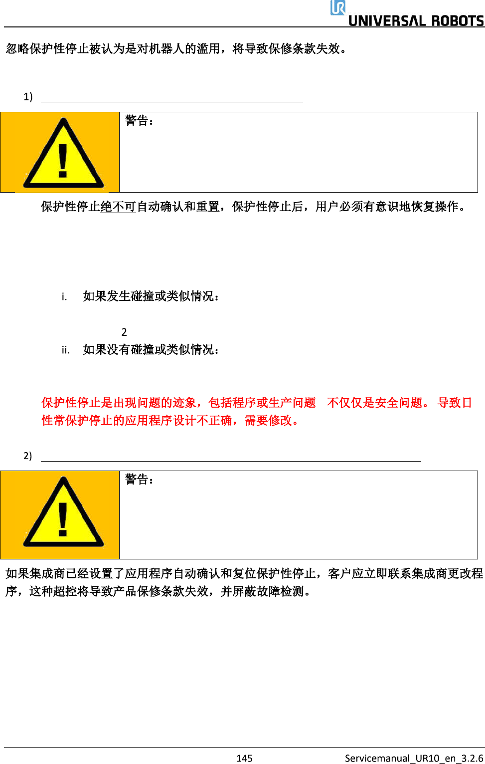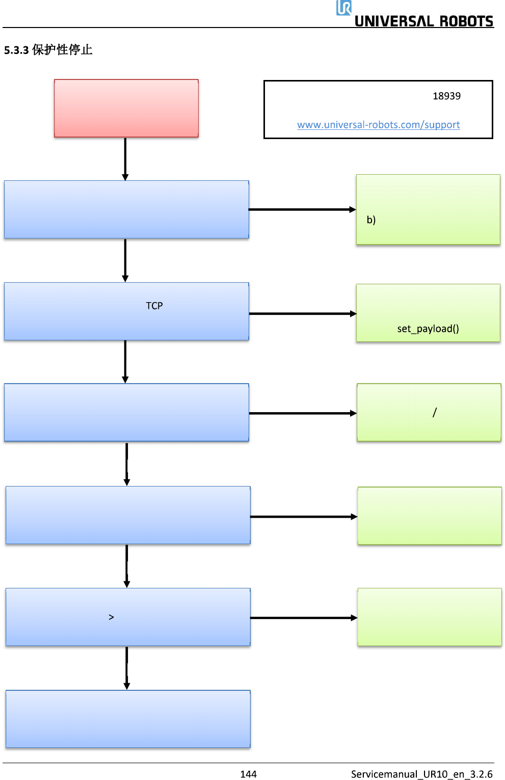 保留所有 权 利 保护性停止 质心是否不同于 点? 检查工具中心点配 置、有 效负载和安装设置, 其必须符合工具 和机器人 的实际位置。 路点位置是否非常 靠近机 器人不能操作的底座 周围的圆柱形区 域? 调整路点,远离 该区域或 降低速度 加速度 是 否 检查工具中心点 配置、有 效负载和 安装设置 检查是否遵循 了安全设 置 是 在工具中心点丝 锥中,调 整质心,或使用 脚本代码 是 否 机器人以过高的 速度移动 ,还是加速非常困 …