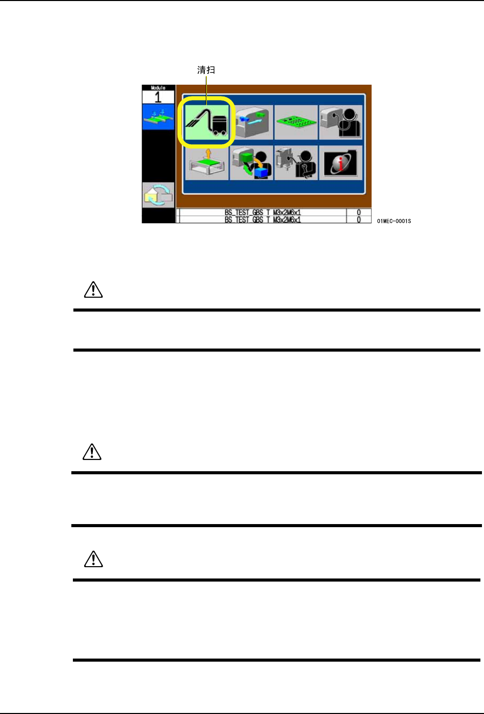 5. 基本操作 QD029-27 90 NXT 机械手册 3. 按下操作面板的 「MANU AL」按钮,显示出手动指令 。 4. 按下光标键,选择清扫示意图。 5. 在确认模组前侧是否有障碍物以后按下 「OK」按钮。夹板被解除后,模组自动向前移动 一些距离。 备注 )· 模组没有被松开时,请依据所显示的信息调查原因。 · 在 M3(S) 模组上,可以考虑是 XS 轴的位置不正确 ( 进入相邻的模组内 ) 等原因。 6. 请握住模组的手柄…