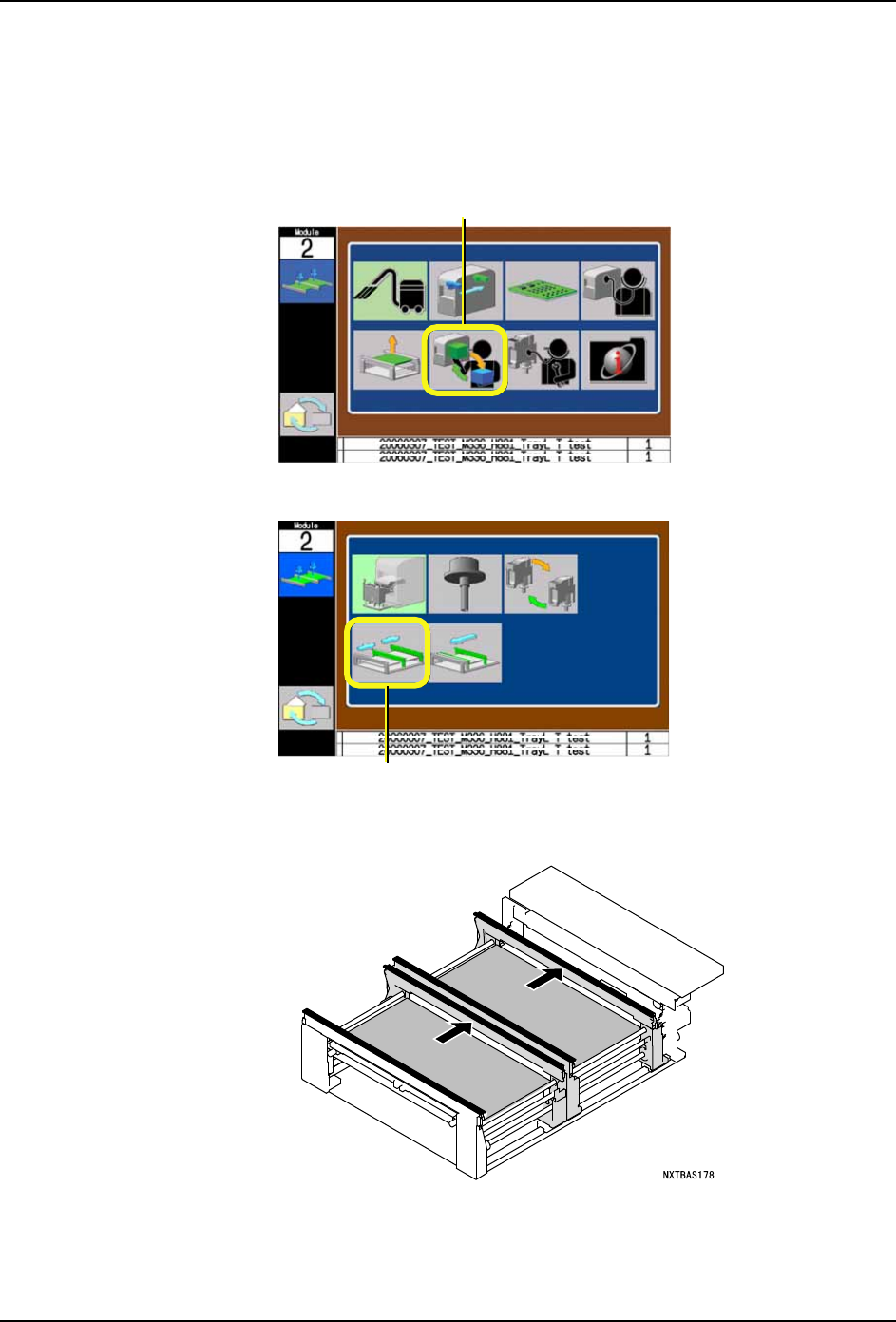 QD029-27 5. 基本操作 NXT 机械手册 147 5.10 支撑板的更换 支撑板的更换可认为有以下的 4 种方法。 ·同时更换通道 1、2 ·连同通道一起更换 ( 将通道 2 向前移动一些后更换 ) ·将生产线从单通道生产变更为 到双通道生产 ·将生产线从双通道生产变更为 到单通道生产 此外,附带有料盘 -L/LT 的模组时,两者的步骤都不同。 在 M6S 模组上进行支撑板的更换时,请在线性马达的 往复臂处于常温后设置保护盖罩…