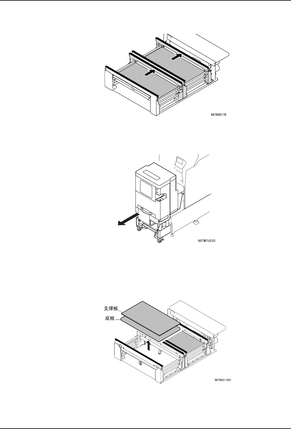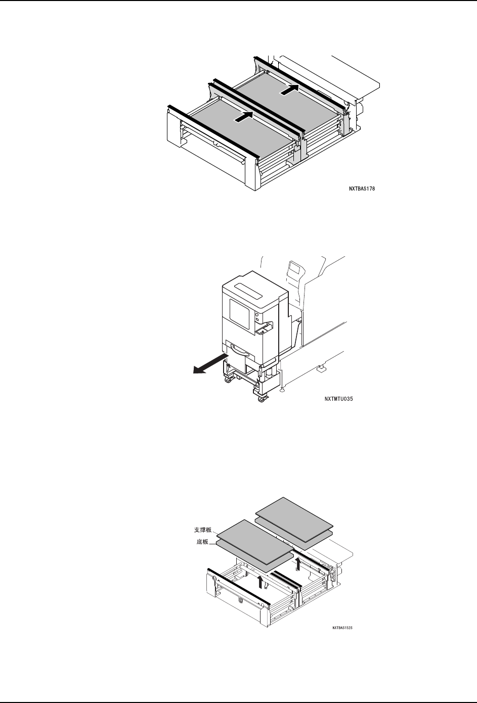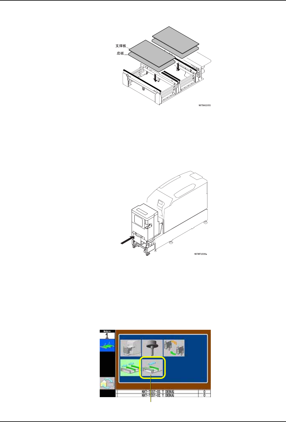 5. 基本操作 QD029-27 162 NXT 机械手册 9. 请安装新的支撑板,按下 OK 键。 10.请插入模组。 a. 握住模组的手柄,直到碰到阻停块为止慢 慢地插入。 b. 模组自动地被拉入后锁定。没有被锁定时 ,请稍微拉回一些模组后重新压入。 11.请安装料盘单元 -L /LT。 安装方法请 参考 " 5.5 料盘单元 -L 的拆除 / 安装 "" 5.6 料盘 单元 -LT 的拆除 / 安装 …