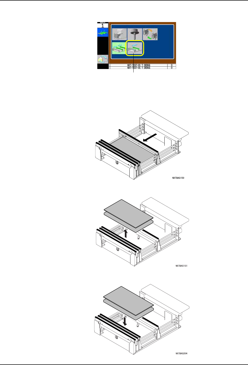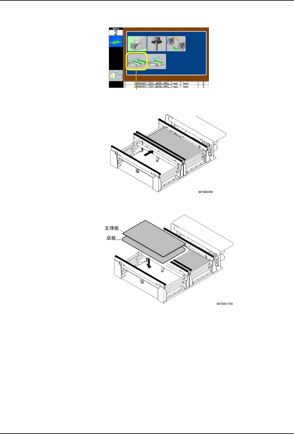 QD029-27 5. 基本操作 NXT 机械手册 165 17.请选择支撑板更换 指令。 18.请按下 START 按键。 将搬运轨道扩大到 最大宽度,显示出更 换支撑板向导。 19.请在通道 1 上安装新 的支撑板、按下 OK 按 键。 20.请插入模组。 a. 握住模组的手柄,直到碰到阻停块为止慢 慢地插入。 b. 模组自动地被拉入后锁定。没有被锁定时 ,请稍微拉回一些模组后重新压入。 6<66 ᤶᬃ ᩥ ᵓ…