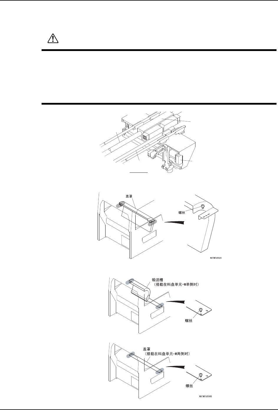 5. 基本操作 QD029-27 188 NXT 机械手册 更换方法 1. 拆除拧紧的螺丝,拆除标准的输送槽。 2. 使用拆除的螺丝,安装与料盘单元 -M 相对应的槽或者盖罩。 注意 在进行 M6S 操作时,请不要将输送槽接近 Y 轴。由于线性马达会产生磁力吸引输送槽, 有可能造成输送槽或者轴的损伤。 在进行 M6S 模组的工作头更换和维修保养操作时,请注意不 要将物品碰到线性标尺上 , 会造成损伤,如果在线性标尺上发生 了伤痕或者错误…