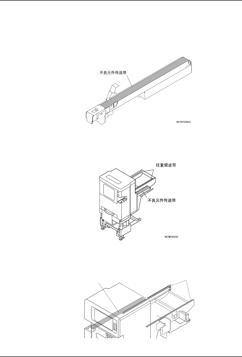 1. 拆除排出不良元件的传送带。( 详细请参考 " 8.3 不良元件排出单元的更换 "。)