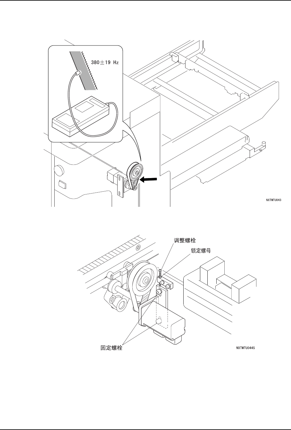 1. 请测定皮带的张力。确认皮带中央的测定值是 380±19Hz。