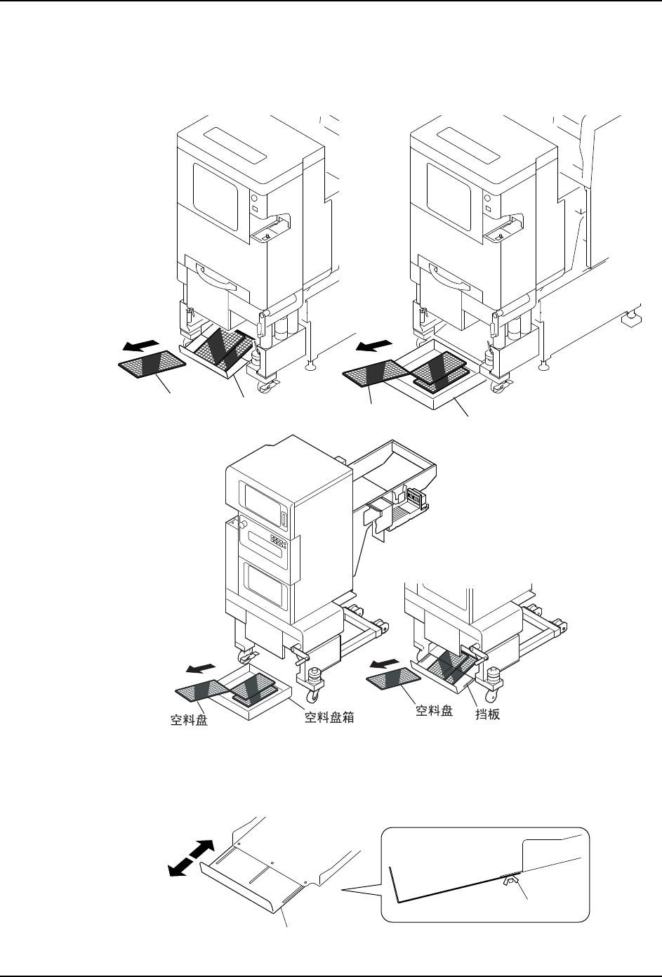 6. 预防保养 QD029-27 298 NXT 机械手册 6.10.5 空料盘的回收 适时 1. 请回收排出的空料盘。 备注 ) 1.有设置空料盘箱和挡板的时候, 无论何种情况请都用手回收。 即使在自动运转中也可 回收空料盘。 2.松开挡板后面的固定螺丝后可以将挡板进行前后滑动。请根据需要调整使用。 1;7078D6 ぎ᭭Ⲭ ᣵᵓ ぎ᭭Ⲭㆅ ぎ᭭Ⲭ 01MEC-0443S 1;70786 ᅮ㶎ϱ ᣵᵓ fPAsb6Qk …