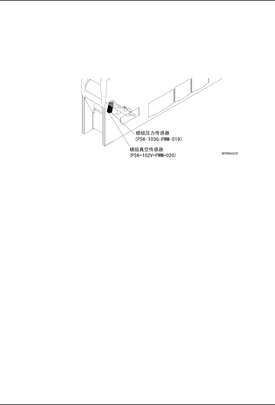 9. 测定和调整 QD029-27 484 NXT 机械手册 9.3 模组真空传感器的灵敏度调整 9.3.1 调整方法 1. 请向前方抽出要调整的模组。 (请参考 " 5.1.1 拉 出方法 "。 ) 要调整的模组 在基座的左 端,而模组的左侧带有盖罩时,要 将侧面的盖罩取下以腾出传感器附 近的空间。 2. 模组压力传感器配置在前面左下方。这个 位置上有编号的传感器有 2 个,从模组的前面 看过去位于后侧的一个为压力…