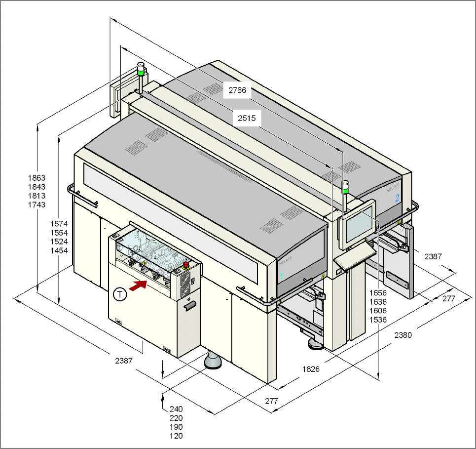 Käyttöohje SIPLACE X-sarja Automaatin tekniset tiedot Alkaen ohjelmistoversiosta SR.70x .xx Painos 01/2011 Mitat ja paino 109 3.3.2 Mit at 3.3.2.1 X4I-automaatin mit at 3 3 Kuva 3.3 - 1 X4I-automaatin mitat (peruskone) m…
