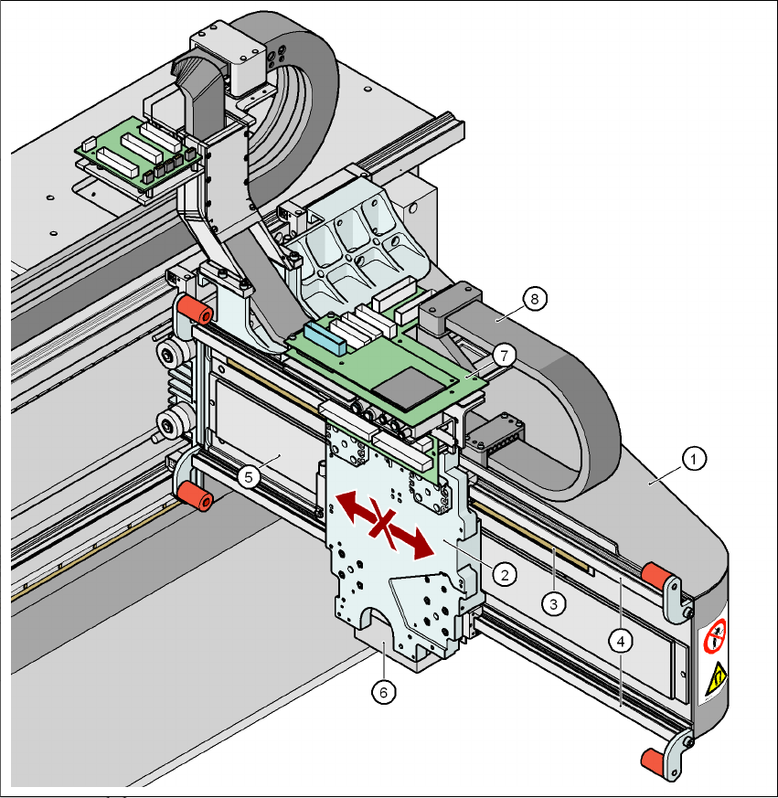 Automaatin tekniset tiedot Käyttöohje SIPLACE X-sarj a Portaalijärjestelmä Alkaen ohjelmist oversiosta SR.70x.xx Painos 01/2011 144 3.6.2 X-akselin rakenne 3 Kuva 3.6 - 5 X-akselin rakenne (1) Portaalin poikkikannatin (2…