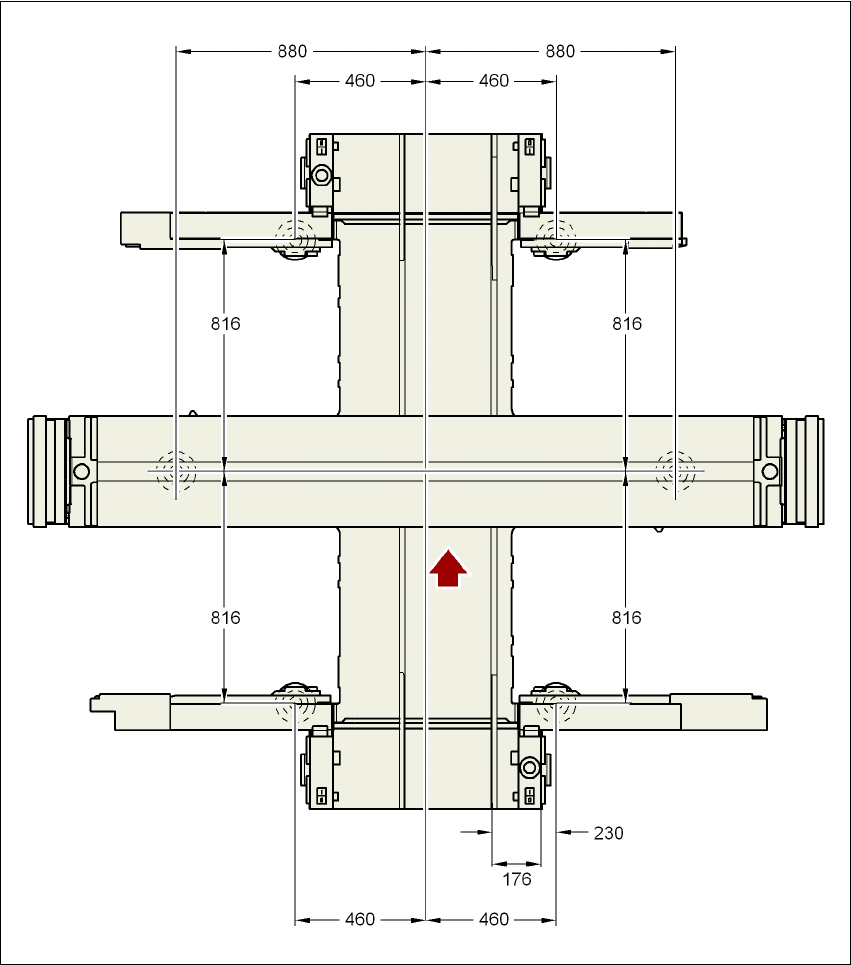 Kuva 4.3 - 24 Koneen jalkojen ja PL-yksittäiskuljettimen kiinteän vasemman reunan etäisyysmitat millimetreinä