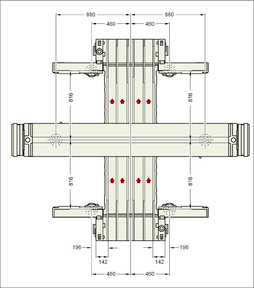 Kuva 4.3 - 27 Koneen jalkojen ja Quad Lane -kuljettimen etäisyysmitat millimetreinä