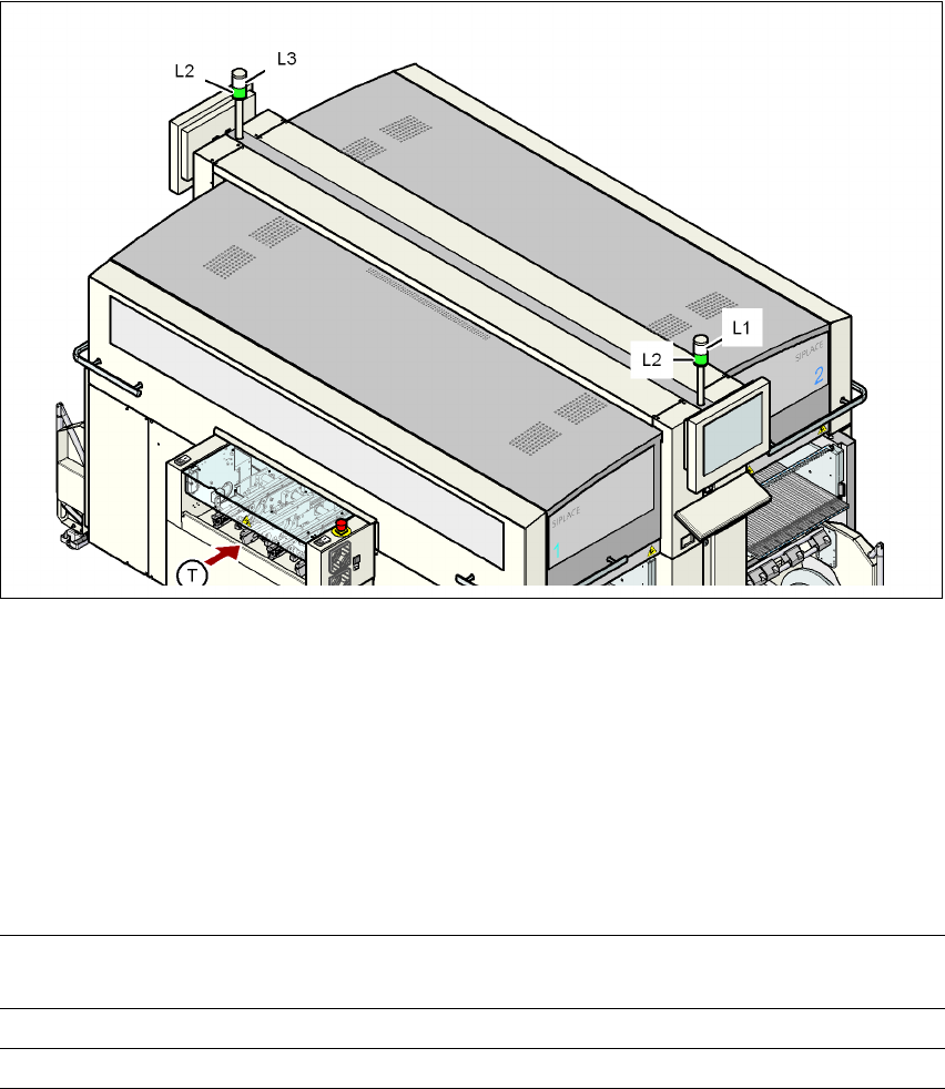 Koneella suoritettavat tehtävät Käyttöohje SIPLACE X-sarja Ilmoitusvalojen statusnäytöt Alkaen ohjel mistoversiosta SR.70x.xx Painos 01/2011 316 5.7.3 V ihreät ilmoitusvalot Molemmilla puolilla on yksi vihreä valo. Molem…