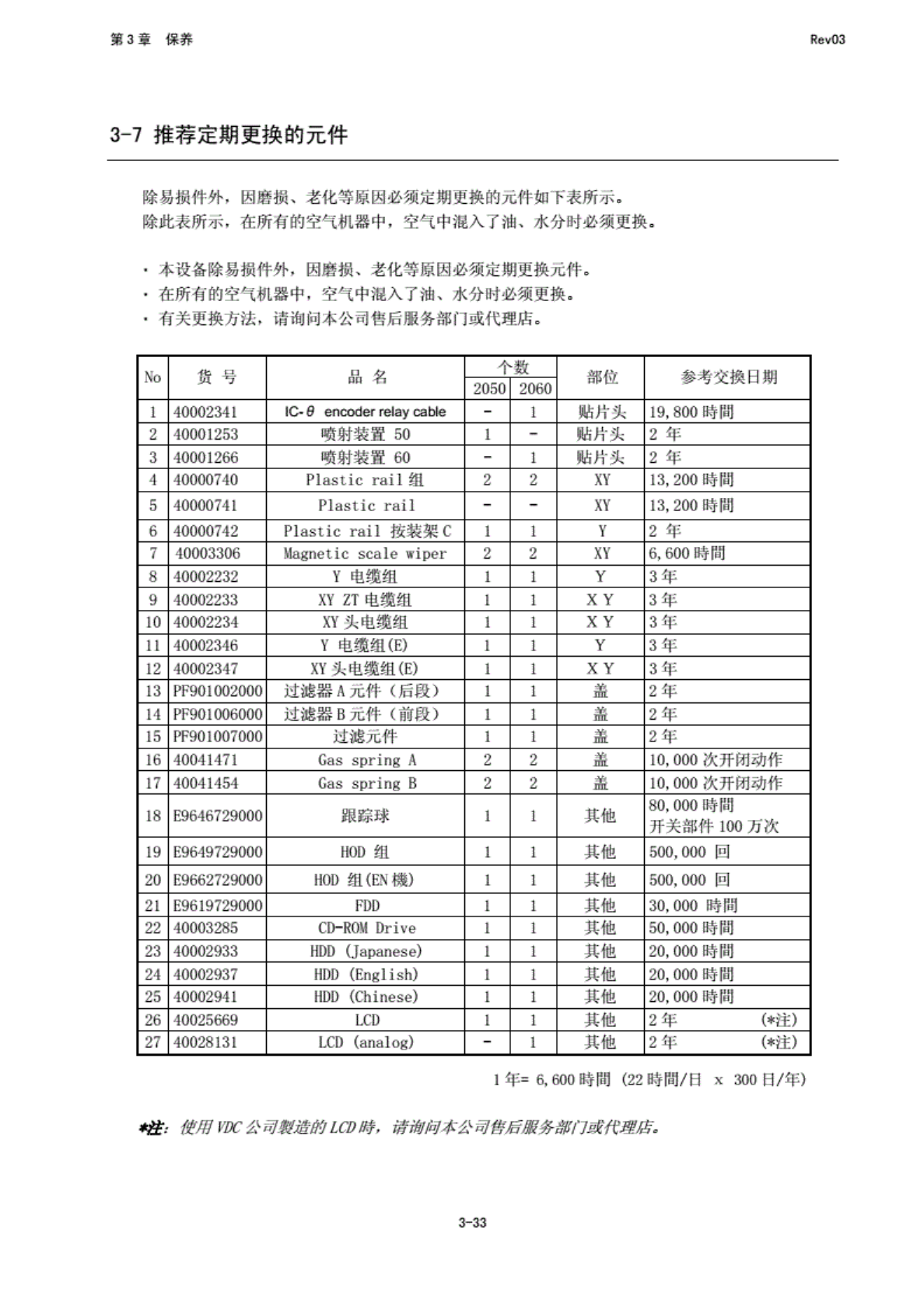 第 3 章 保养 RfivO3 3-7 推荐定 期更换 的元件 除易 损件沿 .因 磨损、 老化等 原因必 ,须 定期更 换的元 件如下 表所小 . 除此表 所示. 在所 有的空 飞 机器中 ,-空 / 中混入 了油、 水分 时必须 更换. 本设备 除易损 件外 ,因 磨损、 老化等 原因必 须定期 更换元 件. 住所仃 涧穿 V 机器中 ,空 ’i 中混入 了油、 水分 时必须 更换. ,有关 更换方 法, 请询 美更公 司总后 靖务…