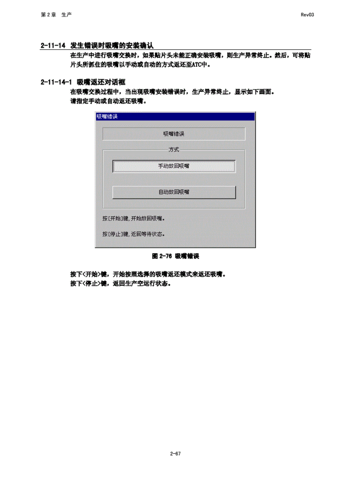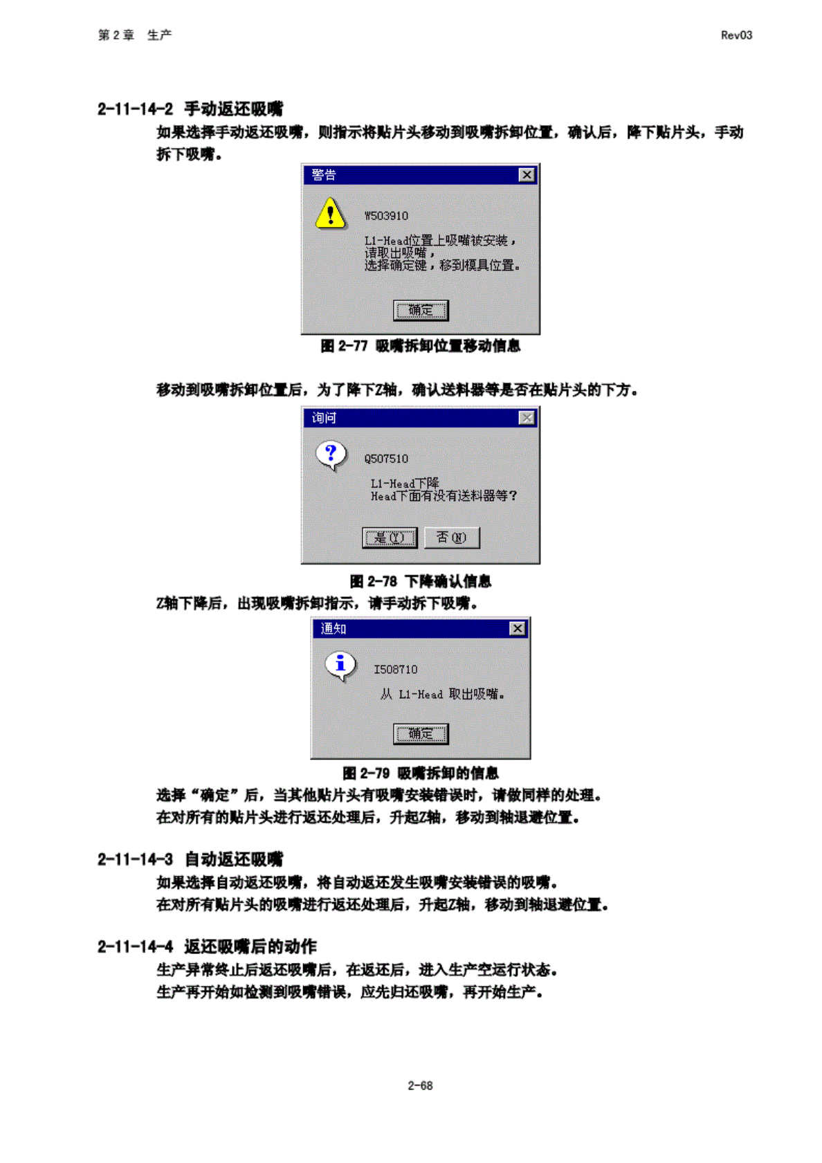 第 2 章 生产 Rev03 2-11-14-2 手幼返 还吸嘴 如果 选择手 动返还 吸嘴, 则指示 将贴片 头移动 到政嘴 拆暂位 ・, 确 认后, 降下贴 片头, 手动 拆下 吸嘴. S 2-77 喊 看去卸 位工移 动值息 移动 到吸需 拆卸位 置后, 为了降 下雨, 确认 送料 器等 是否在 贴片 头的下 方. 图 2-7B 下 降答认 值息 礴下 降后, 出现吸 嘴拆卸 指示, 请手 劫拆下 班嘴. IB £-79 卿 舅拆…