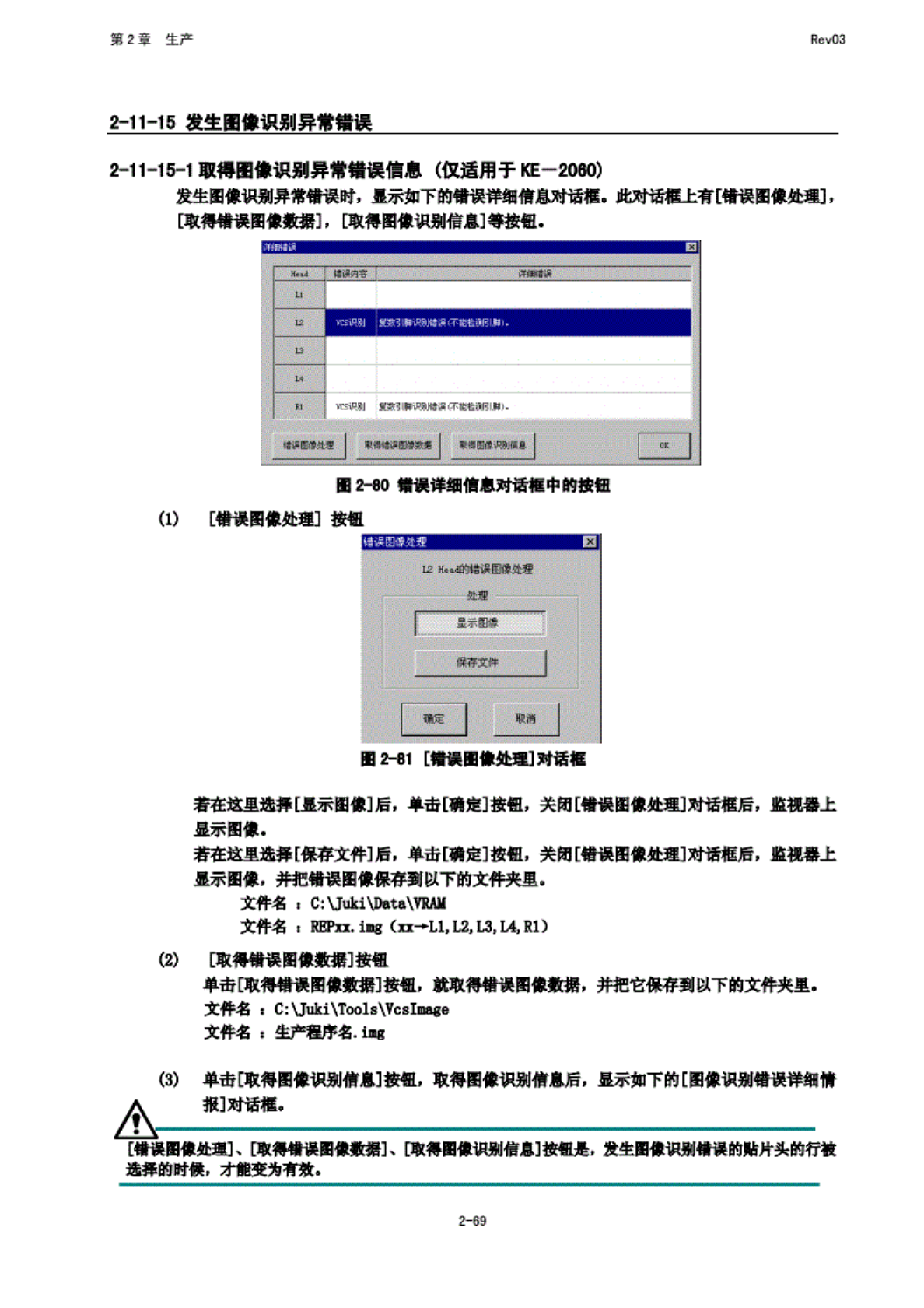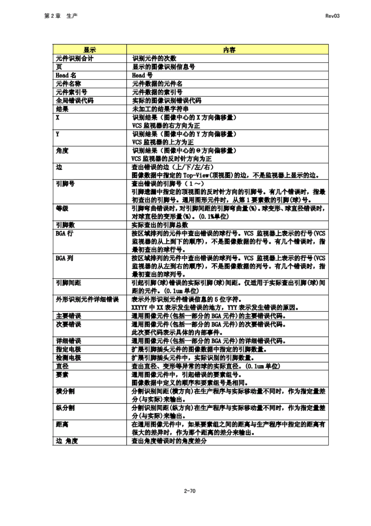 第 2 章 生产 Rev03 显不 内容 元件第 别合计 识 别元件 的次数 显 示的图 像识别 信息号 Head 名 *4 号 元件 名称 元件 数据的 元件名 元件 聚事号 元件 数据的 索引号 全局错 误找码 实际 的图辑 识别错 误代码 转果 未加工 的结果 字符串 X 我 别结果 (图集 中心的 工方向 偏 移量) WS 监视墙 的右方 向为正 Y 识 别第果 C 图像 中心的 Y 方向偏 移量) KS 监视 方为正 箭度 识…