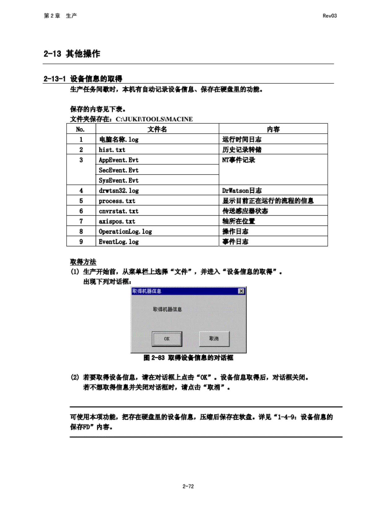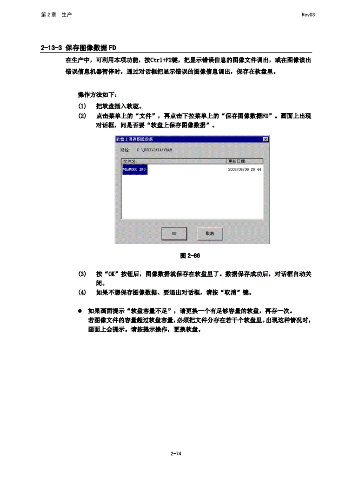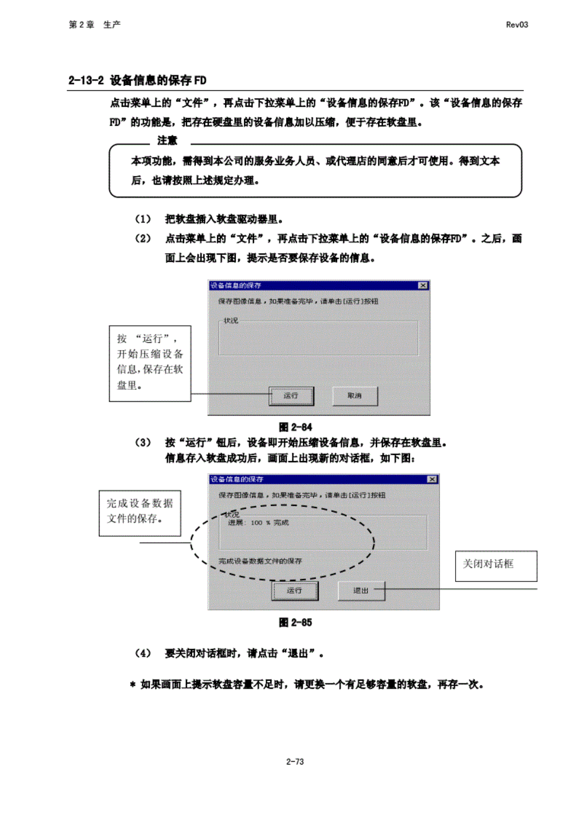 第 2 章 生产 Rev03 2-13-2 设备 借患 的保存 FD 点 击菜单 上的 热文 件* , 苒点击 下视髀 上的 © 设 备信息 的保存 即” . 该 .设 署信息 的保存 即” 的功 能是, 把碎 硬盘 里的设 备信息 加以 压缩, 便于碎 软 盘里. z - 红 V 本项 功能, 需得 到本公 司的服 务业务 人员、 或 代理店 的同意 后才可 使用. 得 到文本 后, 他请 按照上 述规定 亦理. {1》 把 软盘插 …