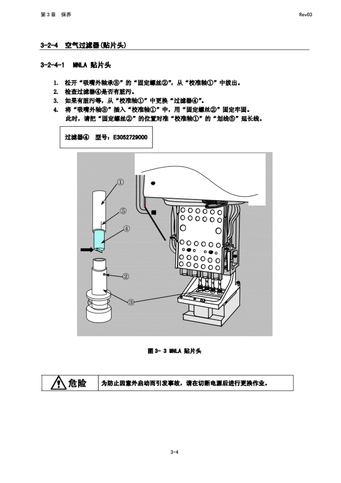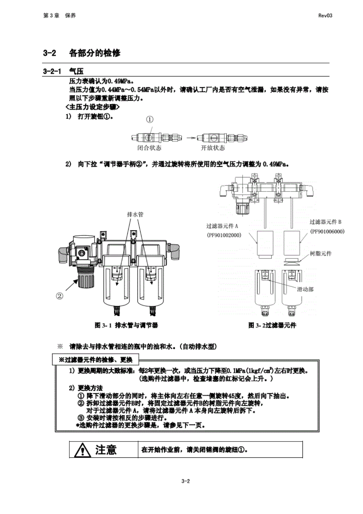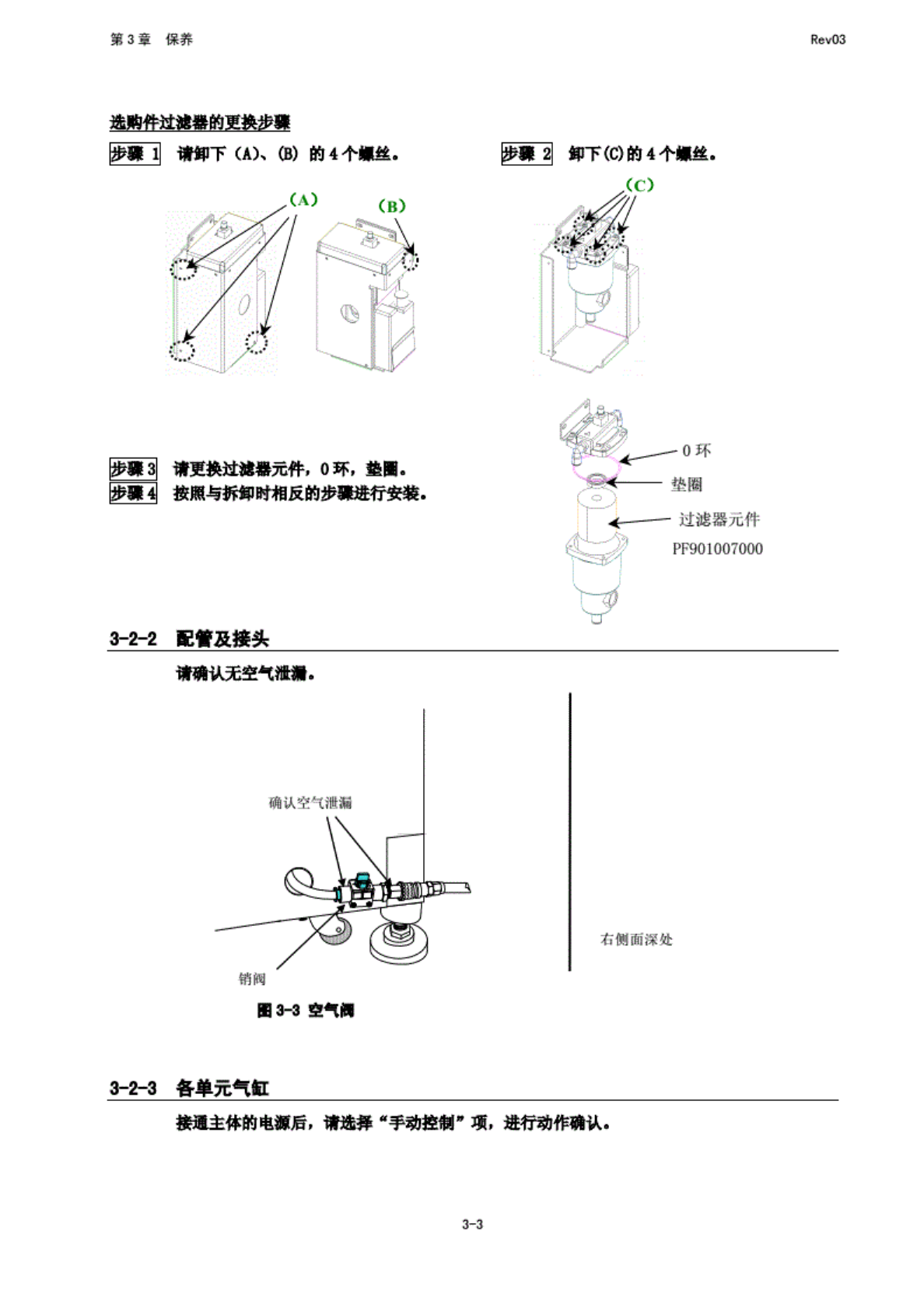 第 3 章 保养 Rev03 选购 性过滤 券的更 换步器 步骤 1 WF Q (B) 的 4 个 i| [丝. 罗爆 3 情 更换过 游器 元件, 0环, 型 II. 按 照与拆 卸时相 反的步 募进行 安装. 3-2~2 配管 及接头 请确认 无空气 泄漏. 步建 2 卸下 的 4 个解. B03-3 空气牌 有俯 面深处 3-2-3 各单 元电缸 接通主 体的电 源后, 请 选择* 手 动控制 B项, 进行 动作确 认. 3-3