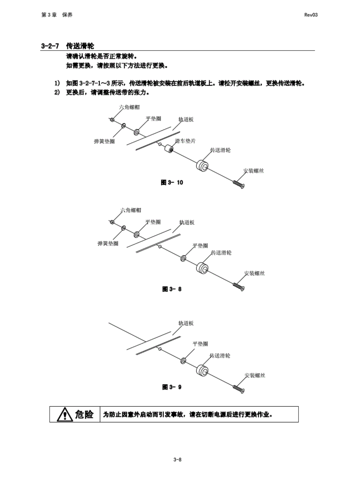 第 3 章 保养 Rev03 3-2-6 传送带 请确 认传 送带 是否有 明显的 磨耗或 破损、 松弛, 如 II 更换, 请按照 以下方 法进行 更换。 1) 松开 安装在 A 部分 长孔 (图 A 6) 中的 "传送 滑轮 (前后 2 处)% 放桧传 送带的 张力, 2) 请从 传送滑 轮上拆 下传送 带进行 更换. 3) 请调 整传送 带的 张力. 送带处 于松弛 状态时 (在传 送带上 没有张 力的状 态), 在检送…