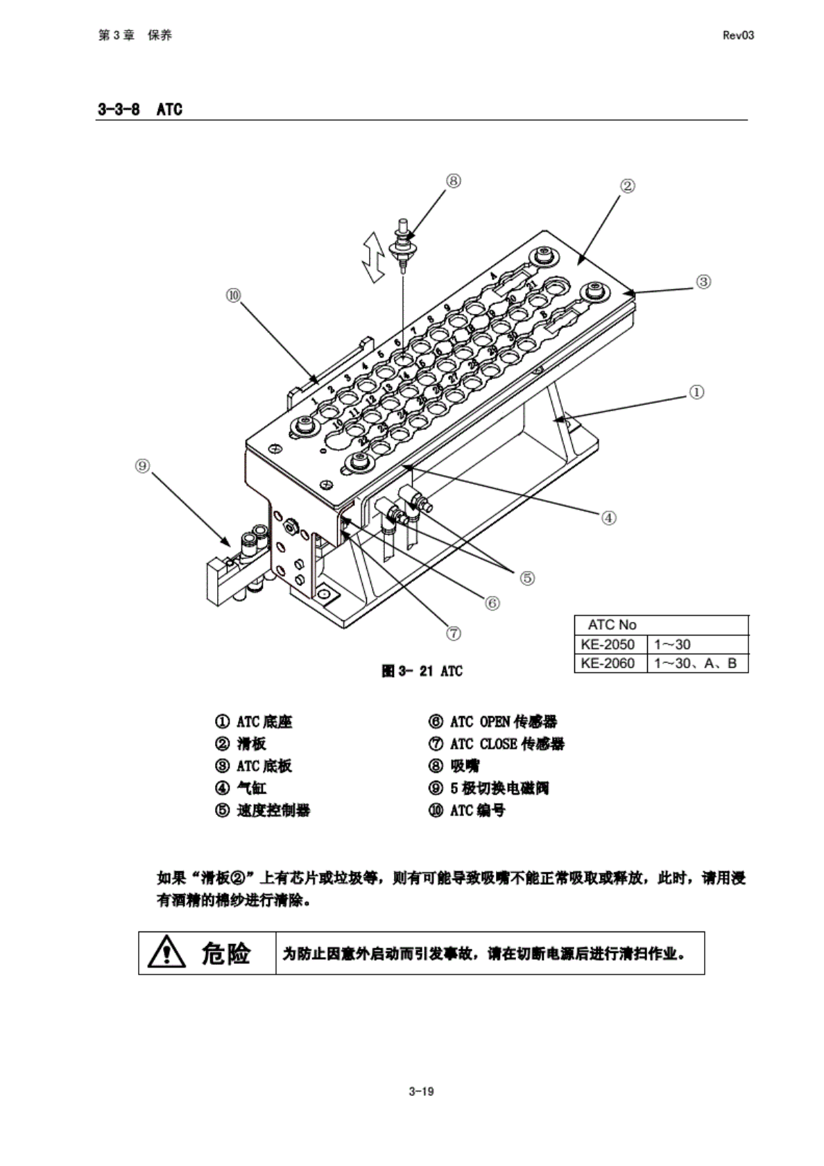 第 3 章 保养 Rev03 3-1 送料 0台 在送 料察 台上安 装带式 送料薯 等送料 署前, 应先 将其雌 干净, 以确 保没有 灰尘和 异物. 电 请稠认 .雉板 晦” 的下部 是否有 异物混 入。 , 当有芯 片等异 物时, 常用 吸尘器 警予以 清石. S3- 22 送料 。台 6m 舞台 期定杆 动气缸 标记 A 危险 为防止 因意外 启动而 熨发事 故, 请在切 断电 源后进 行清扫 作业. 3-20